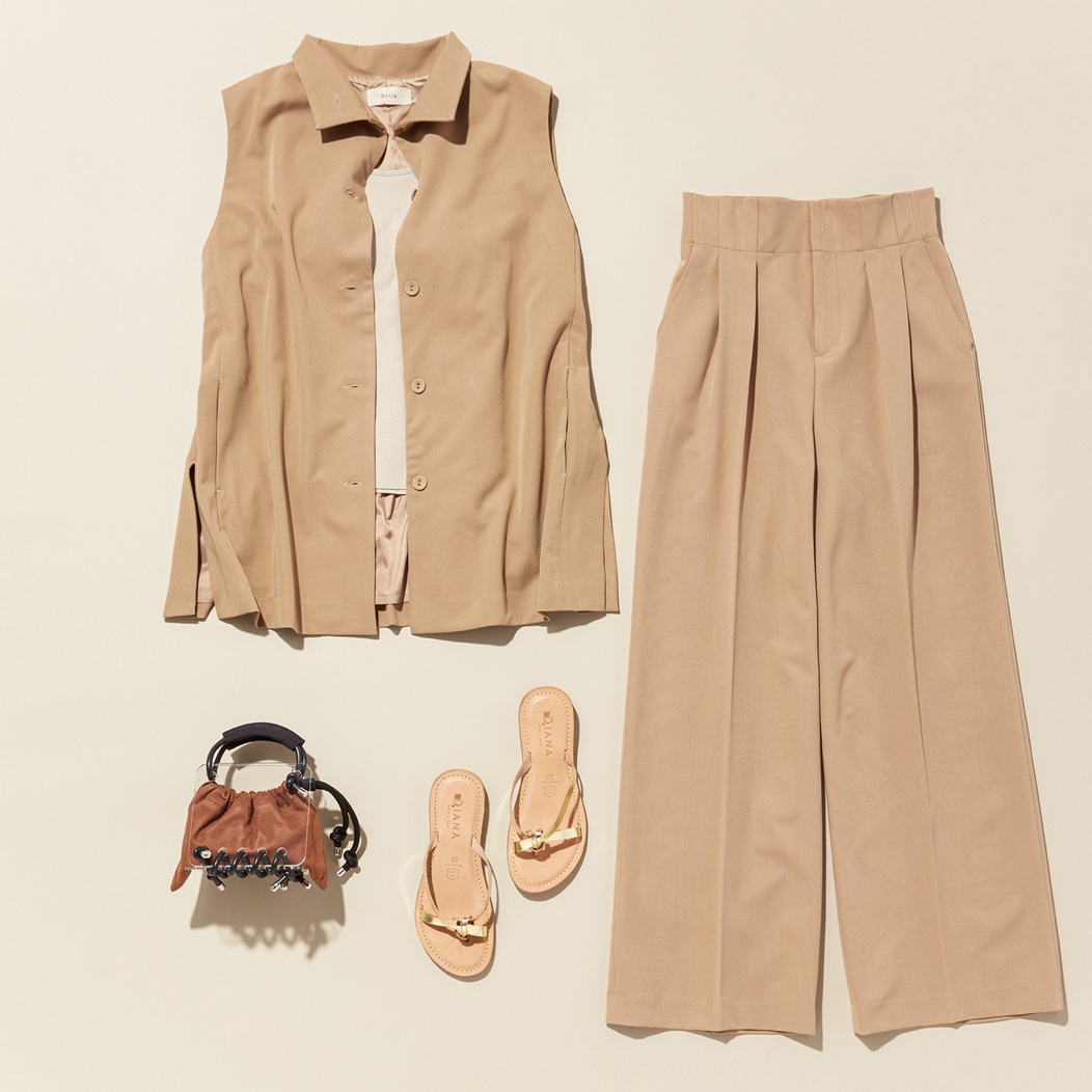 1枚でもレイヤードでも幅広く使えるベストは、ボタン次第でスタンドカラーにもアレンジできて着回し度大。オーバーサイズでブラウスやタートルニットにも重ねられるから、シーズンレスで活躍。おすすめは同じシリーズのハイウエストパンツとのセットアップ。ベスト&タックパンツのIラインを意識した着こなしでバランスアップも実現。