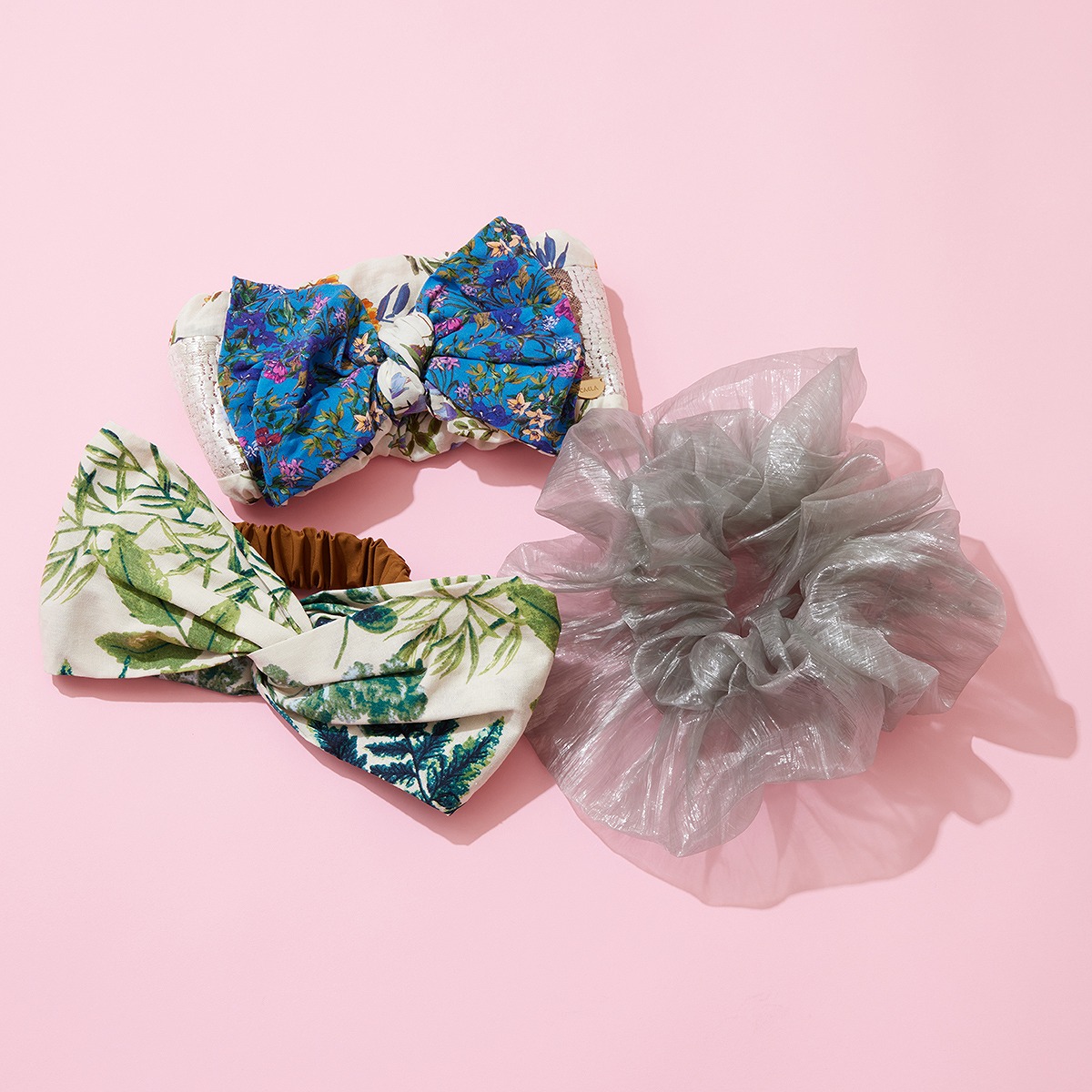 上から時計回り・ヘアバンド¥11,550(CA4LA/CA4LA プレスルーム☎03-5773-3161)ビッグシュシュ¥3,300(キャセリーニ☎03-3475-0225)ヘアバンド¥3,850(irodori/roomsSHOP☎03-3342-0117)