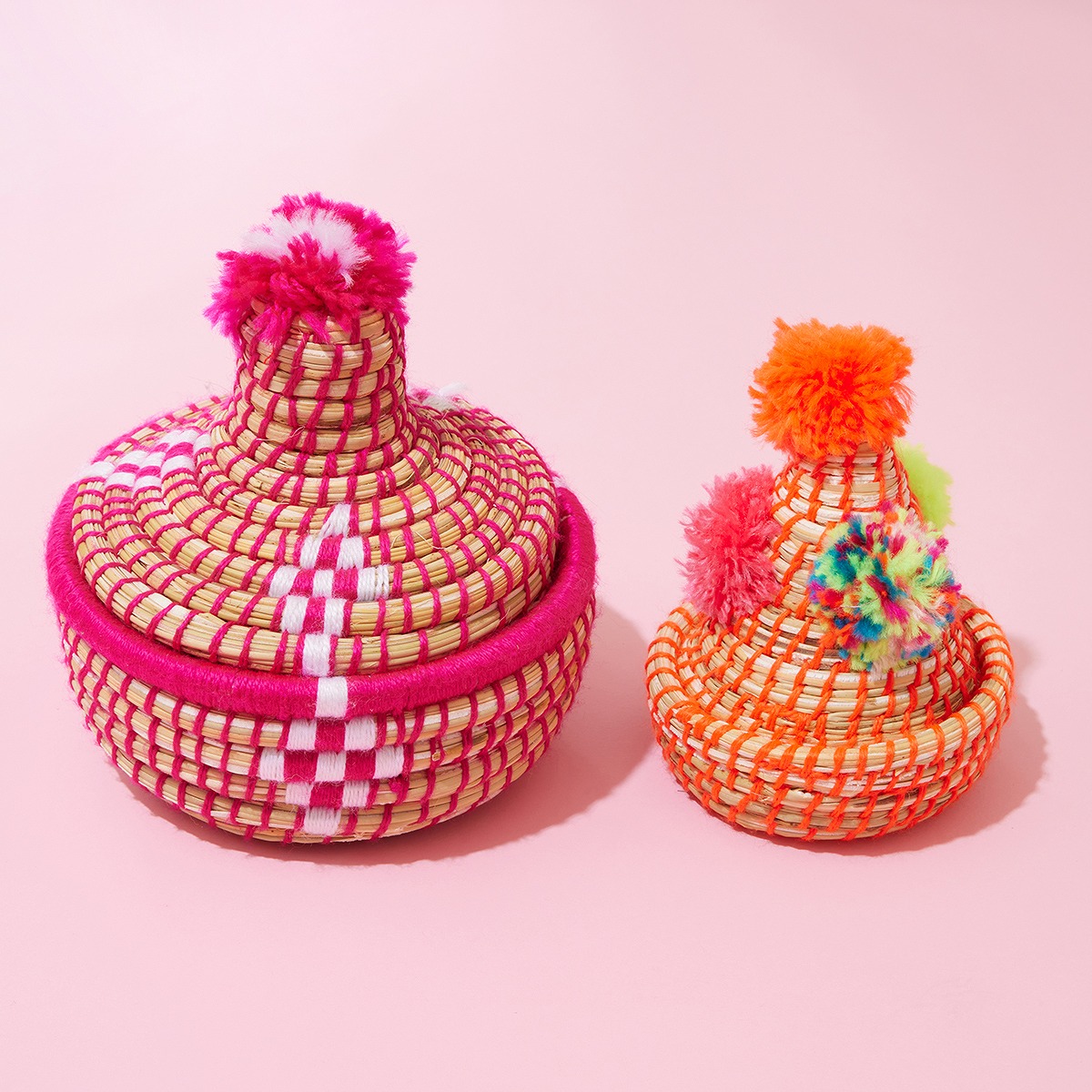 インテリアのワンポイントにもちょうどいい元気カラーの雑材小物入れ。ポンポン付きがお茶目で思わず笑顔に。蓋を開ければ中に物も収納できます。