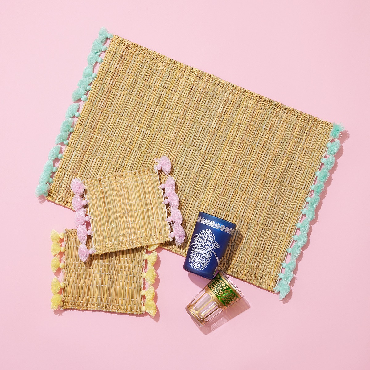 夏らしい素材感とソフトネオンなカラーリングが可愛いランチョンマットとコップ、コースター。テーブル周りを涼しげに&楽しく彩ります。