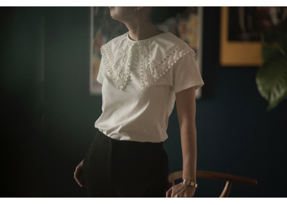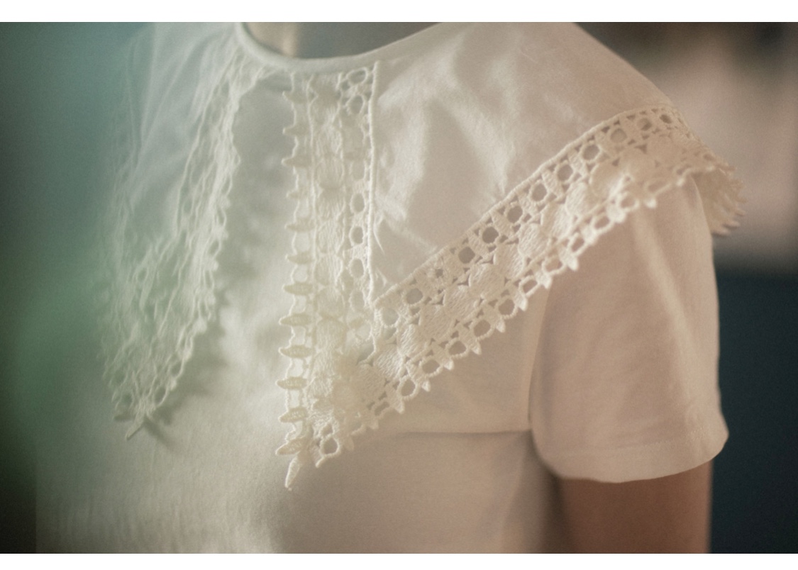 ほらこのとおり、キッズサイズ(SIZE13-14)でぴったりです!こんなレース襟の半袖トップスをずっと探していたのですが(そして実際もう持ってはいるけれどw)、甘くなりすぎない襟先がシャープなモノがほしいなと思っていたのです。あと、中途半端な大きさの襟より、思いっきり大きい襟のほうがモードっぽく着られるんじゃないかな…とも。