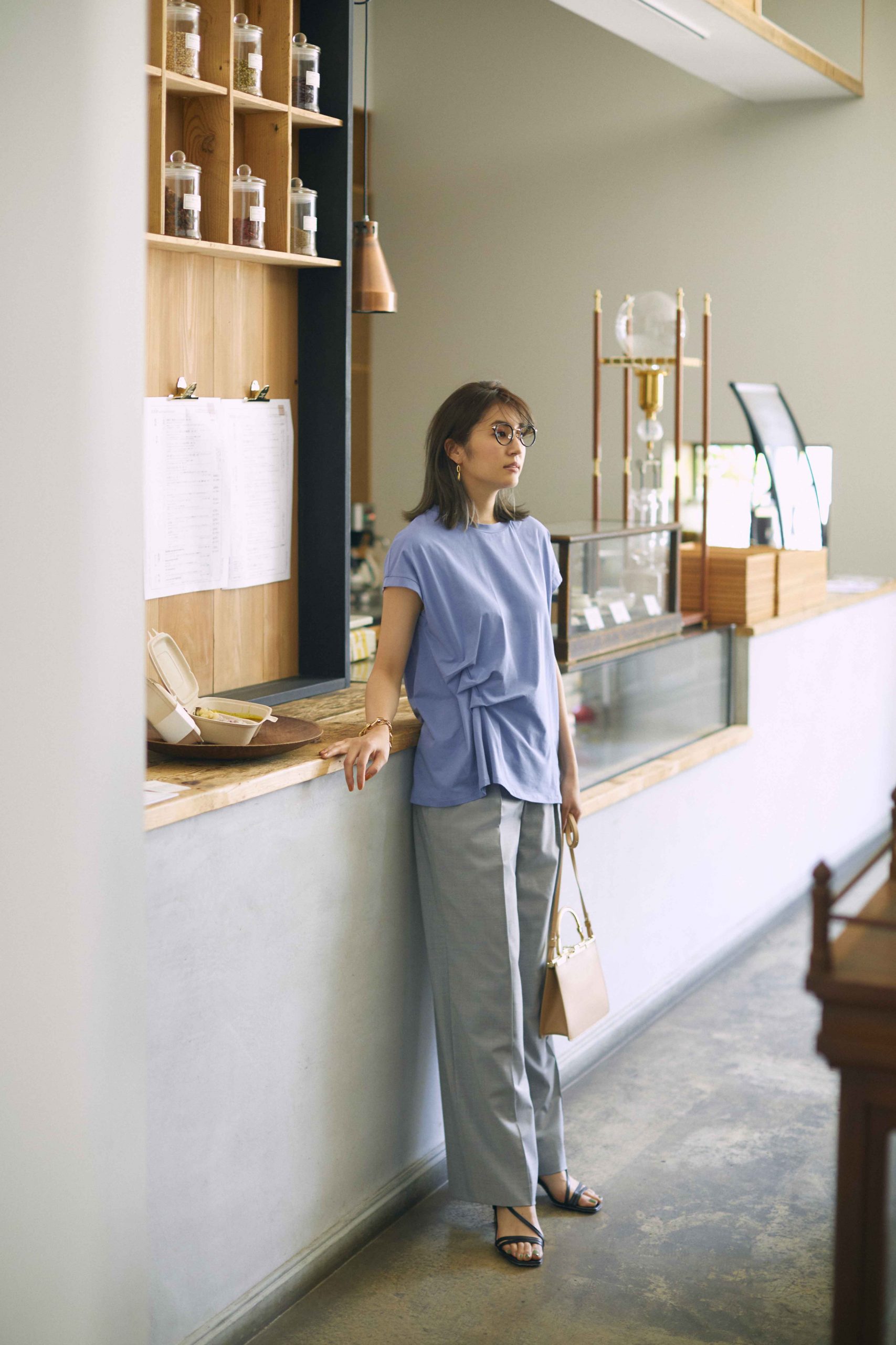 爽やかブルー&タック入りTシャツで、キレイめな印象に。たった2枚のワンツーコーデなのに、きちんと感はしっかりキープしています。ただのTシャツに見えないデザイン性の高さとパステル調のやさしいブルーのおかげです。Tシャツ¥19,800(ANAYI)パンツ¥30,800(コラム/エストネーション)バッグ¥187,000(ザンケッティ/Deuxième Classe 青山店)サンダル¥19,800(モリーニ/JACK of ALL TRADES press room)めがね¥13,200(JINS/JINS カスタマーサポートセンター)ピアス¥4,950(フルオブグレイス/ZUTTOHOLIC)ブレスレット¥37,800(アビステ)