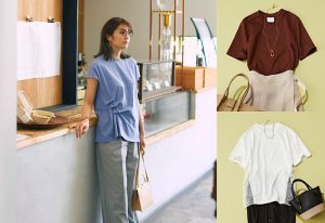 暑い夏こそ、涼しく、楽に、毎日を過ごしたいもの。Tシャツを主軸にした、たった2アイテムのワンツーコーデをお仕事シーンで着るなら? タックやレースをあしらったデザインや、ほどよいフィット感のきれいめTシャツが使えます。