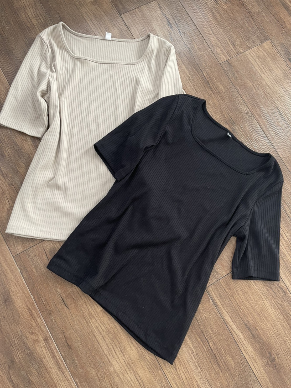 「毎年買い足しているスクエアカットソーは、細見えするリブ感、女っぽいスクエアネック、腕がすっきり見える5分袖と、〝好き!〟が詰まったアイテム。着回し力も抜群で、色違いで買い揃えています。しっかりとした生地なので洗濯にも強く、ほどよいゆとりで体のラインが出すぎないのも気に入っています」
