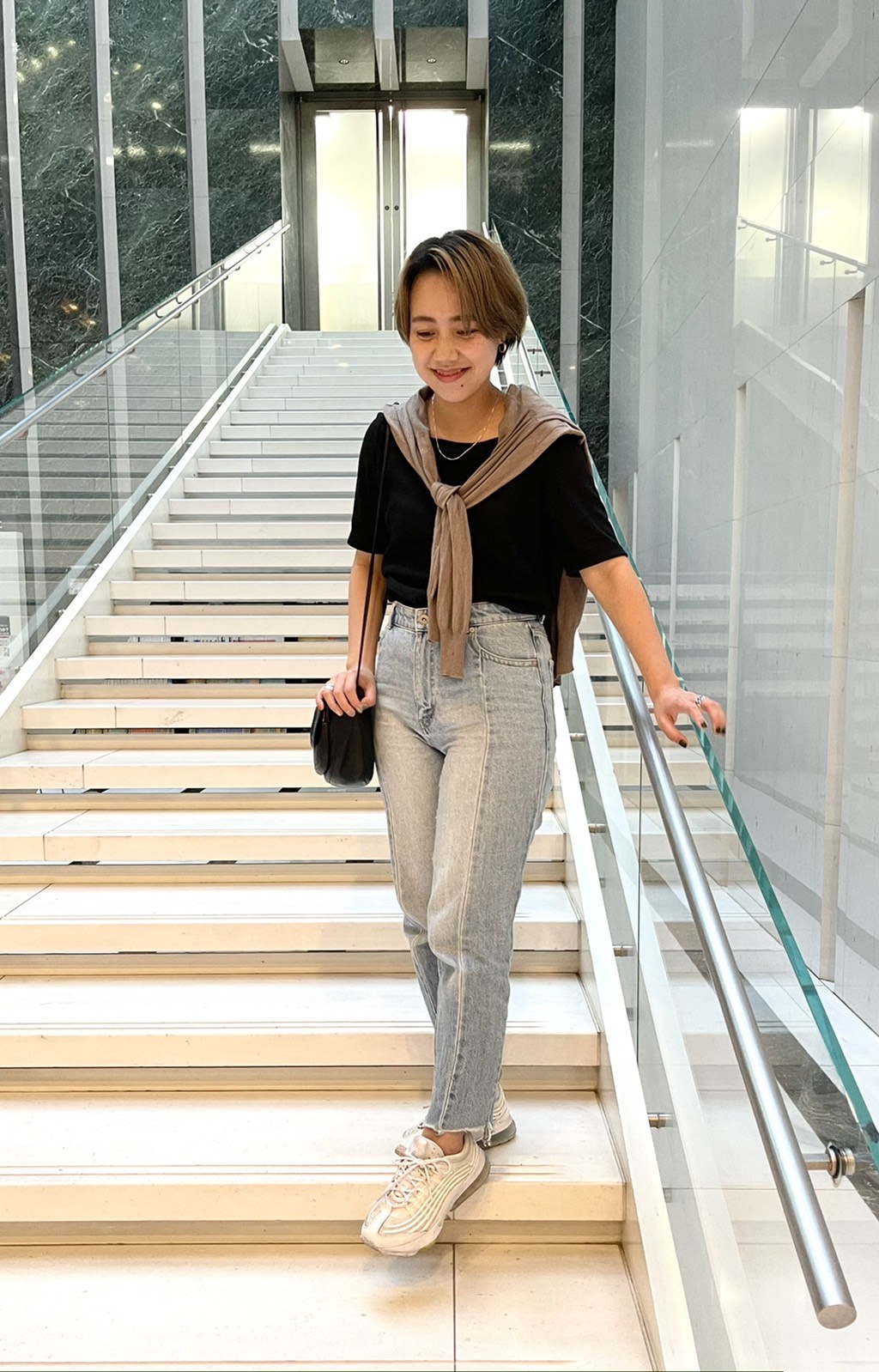 「カットソー×デニムのシンプルコーデも、首元がスクエアだとしっかりと女らしく仕上がります。物足りないと感じるときは、カーディガンを肩掛けすると着こなしに奥行きが生まれるので、取り入れることが多いかも」