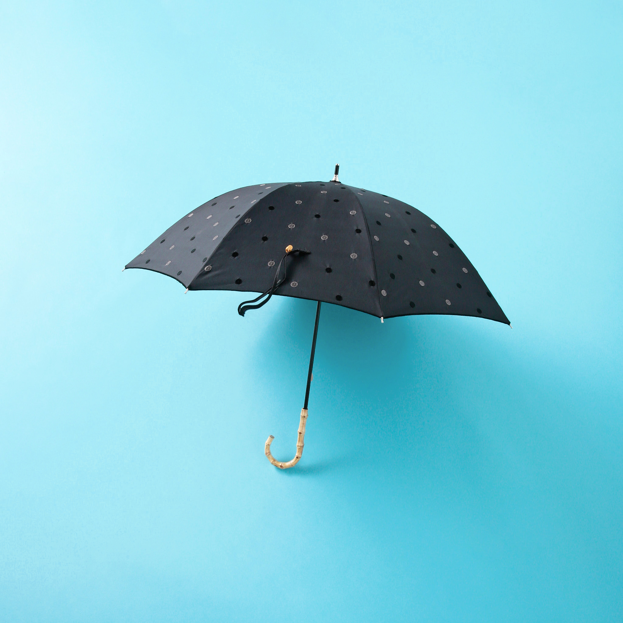 UVカット率90%以上で紫外線対策にも最適。雨の日はもちろん晴れの日の日傘使用も◎。表情のある二色の刺繍ドット。黒ベースだから甘くなりすぎず大人っぽく持てる。ツートンドット晴雨兼用傘¥4,950(レイジースーザン/レイジースーザン 新宿ミロード店)