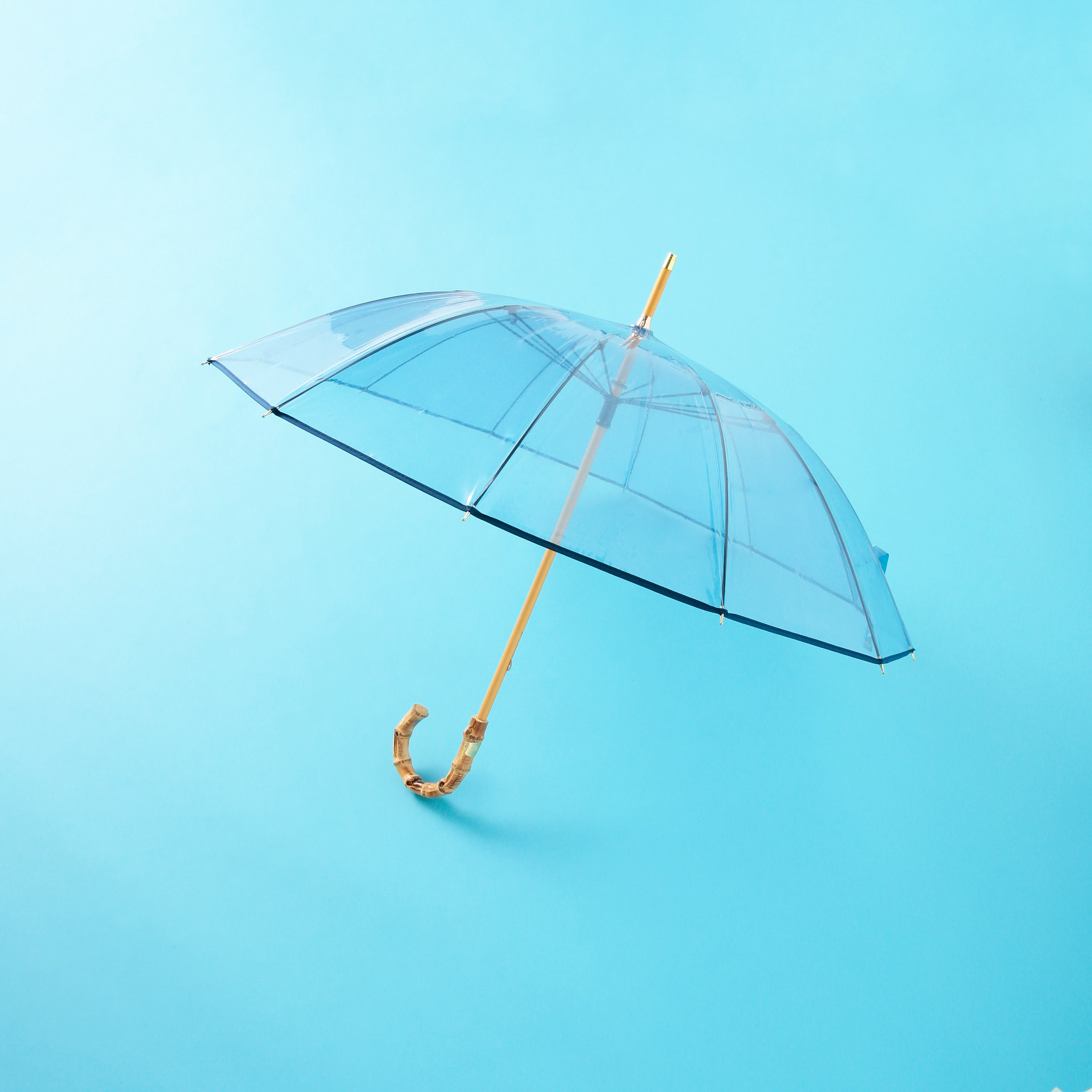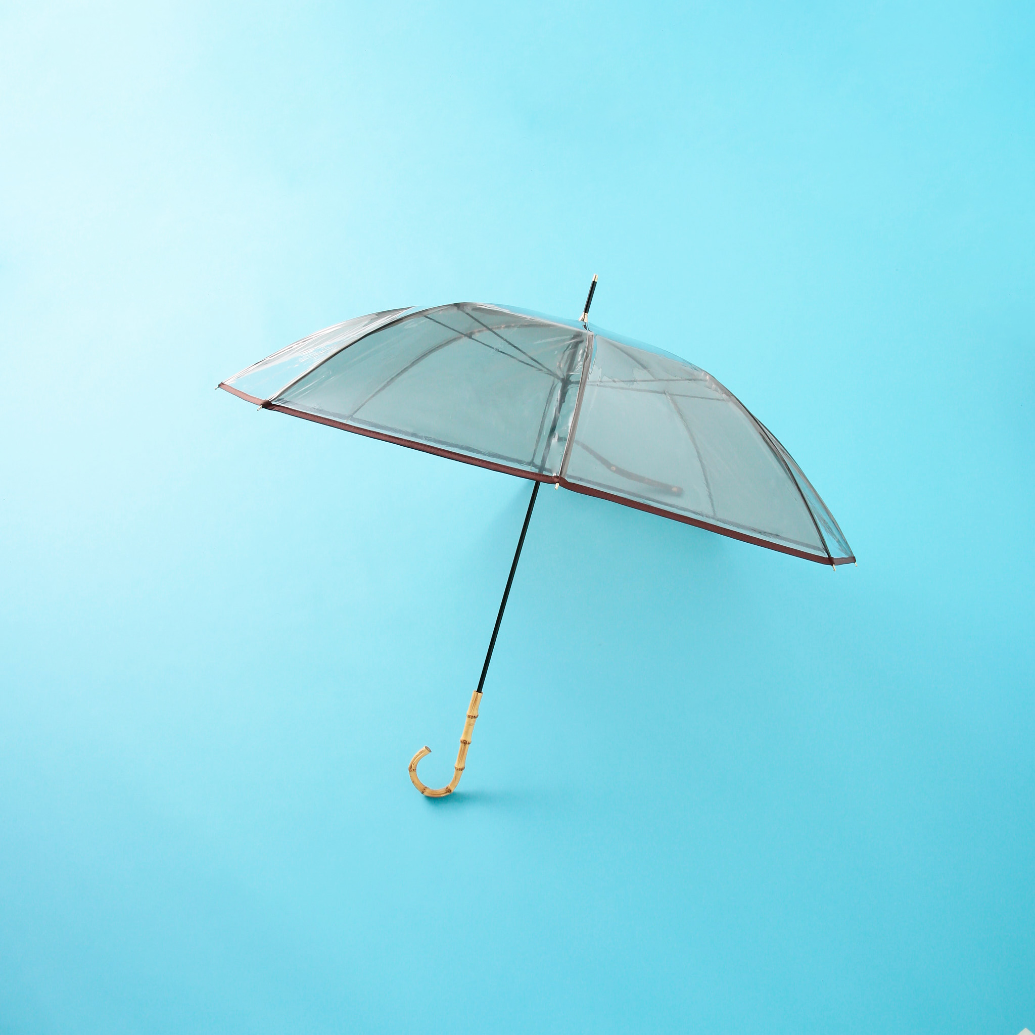 ブルーのビニールが爽やかで涼しげ!本格的なバンブーハンドルでビニール傘が上品なムードに。12本ある親骨がリッチ感を醸し出しながら、強い風にも耐えられて丈夫。クリアアンブレラバンブー¥9,900(トラディショナルウェザーウェア/マッキントッシュ ジャパン)