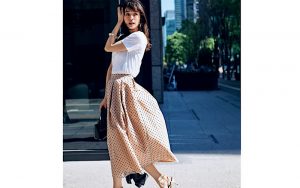 7月2日(金)、甘め要素の強い「ドット柄のボリュームスカート」は、ベージュベース&小さめドットを選んで大人仕様に。コンパクトな白Tでカジュアルダウンすれば、女らしさはそのままに、一気にあか抜け度がアップします。足元は、涼し気な「ストラップサンダル」を選ぶと◎。