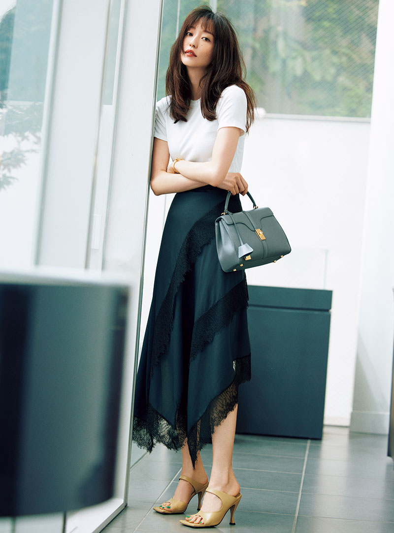 Tシャツをお出かけ仕様に昇華するドレッシーなスカート。モダンな〝セリーヌ〟の小物たちでスマートなリッチさをプラスして。いかにもじゃない華やかさがマイスタイル。