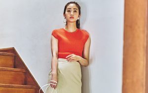 ニット¥18,700(ANAYI)スカート¥38,500(THIRD MAGAZINE)バッグ¥35,200(ジャンニ キアリーニ/ジャンニ キアリーニ 銀座店)サンダル¥26,400(ファビオ ルスコーニ/ファビオ ルスコーニ ルミネ有楽町店)イヤリング¥12,100(マージョリー・ベア/ココシュニック 有楽町マルイ店)