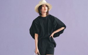 7月10日(土)、子供っぽく見えがちな「盛りブラウス」と「ショーパン」の組み合わせも、オールブラック&シャリ感素材なら問題なし。厚底デザインの「黒スポサン」で、雨の日でも快適な足元に。白のハットやバッグで抜け感を意識した、旬のモノトーンコーデです。