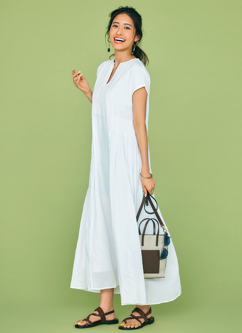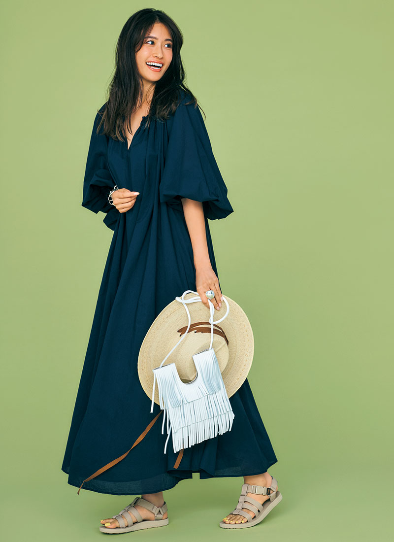 きちんと感のあるデザインよりも、どこか力が抜けたリラクシーな雰囲気のものがサマになる体型。生地も光沢があるものよりも洗いざらしたような生地のほうがしっくり。小物もフリンジデザインなど、ラフな要素があるものが似合います。ワンピース¥35,200(マリハ)バッグ¥23,980(ノマディス/プルミエ アロンディスモン)靴¥8,030(テバ/デッカーズジャパン)ハット¥29,700(シャポー ド オー/シャポー ド オー 東急プラザ銀座店)ブレスレット¥40,700(パズコレクティブ/ZUTTOHOLIC)リング¥18,700(ルフェール/UTS PR)