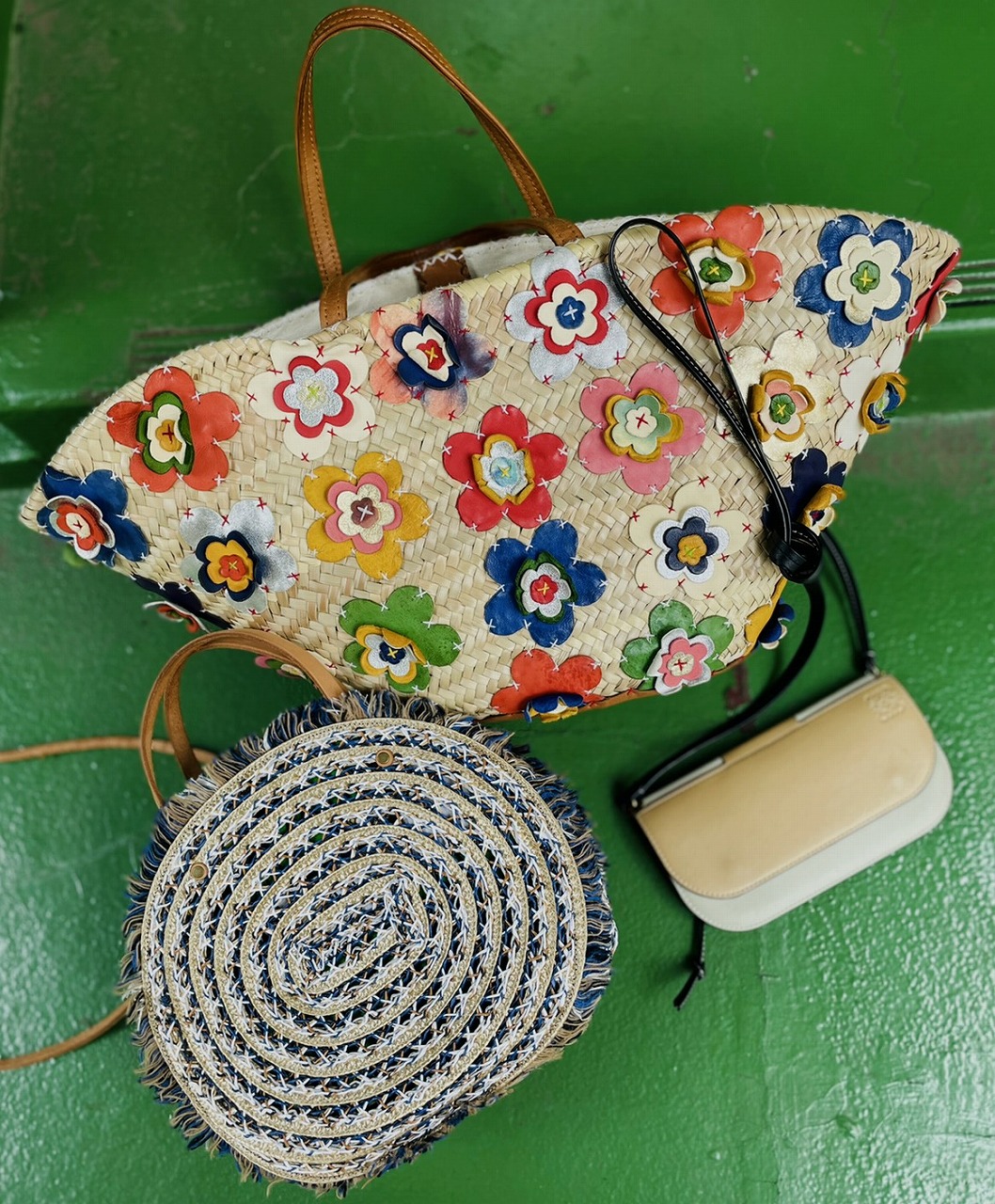 カラフルなお花モチーフのついたかごバッグ。これがあるだけでコーデがパッと華やぎ、いいアクセントになります。意外と大容量なのも使いやすいポイント。