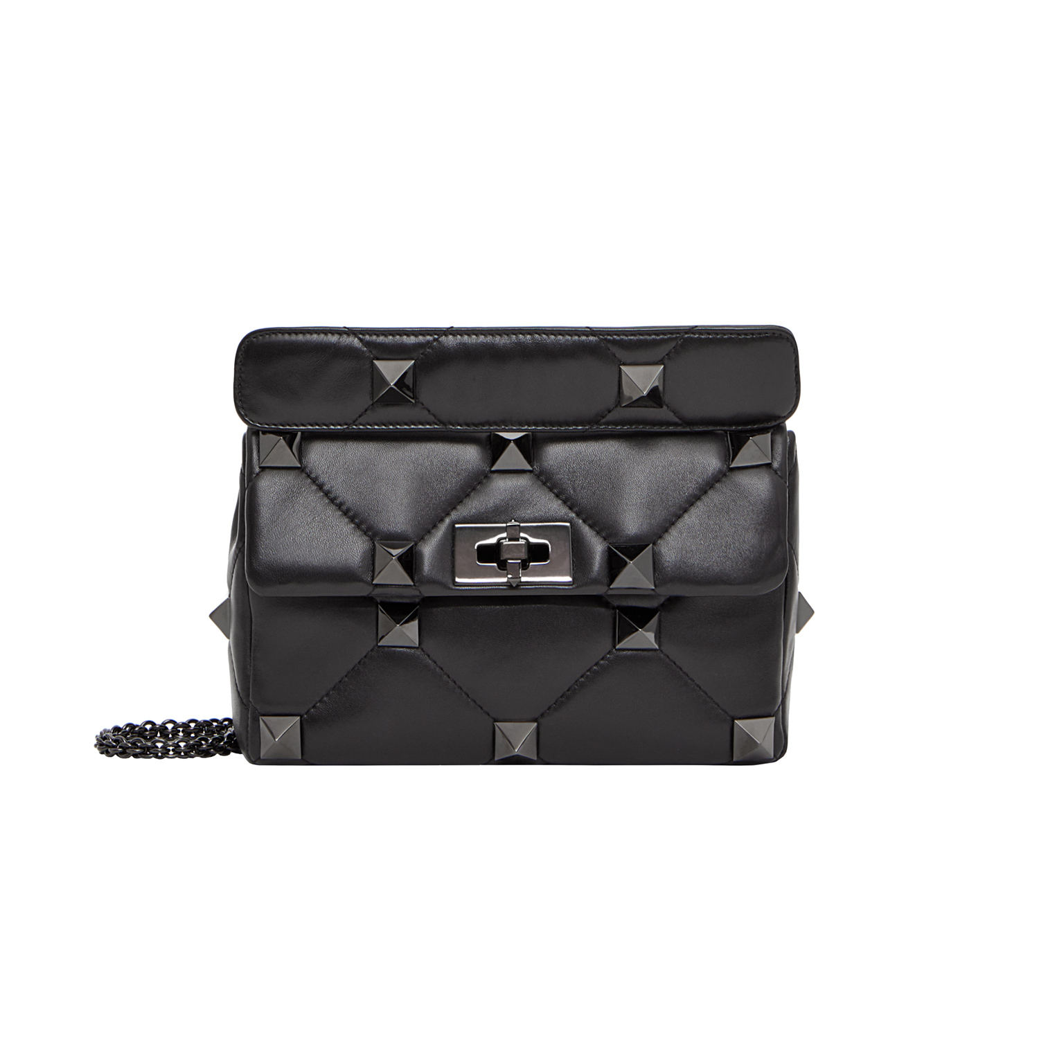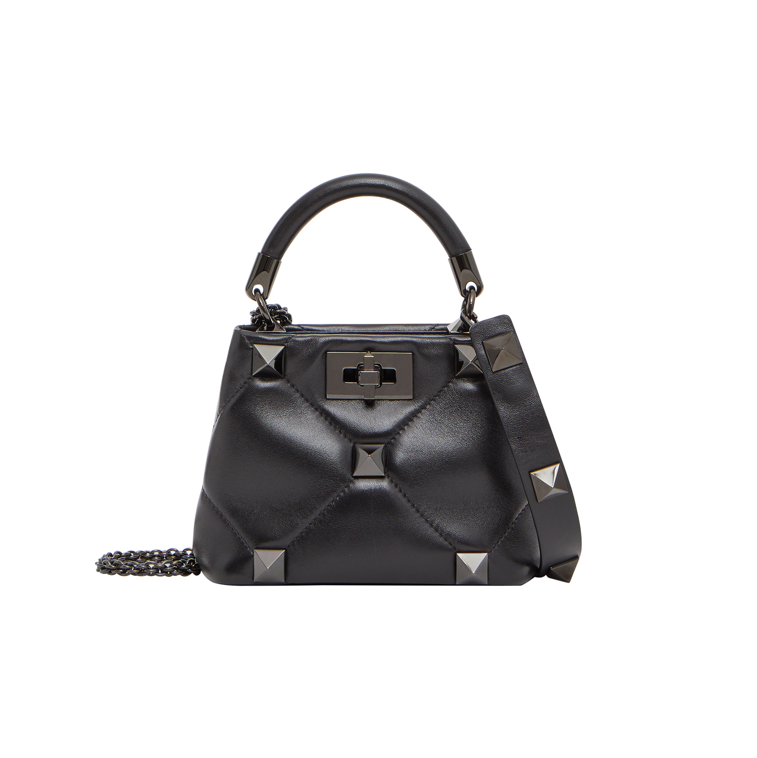 アイコンバッグ“ローマンスタッズ”から、PVD仕上げのつややかなブラックメタルをブラックのレザーに重ねた新作が登場! オールブラックで仕上げることで、素材の質感の違いが引き立ち、見る角度によってさまざまな印象に。着こなしにアクセントを添える、“エレガントな黒”を堪能できます。
