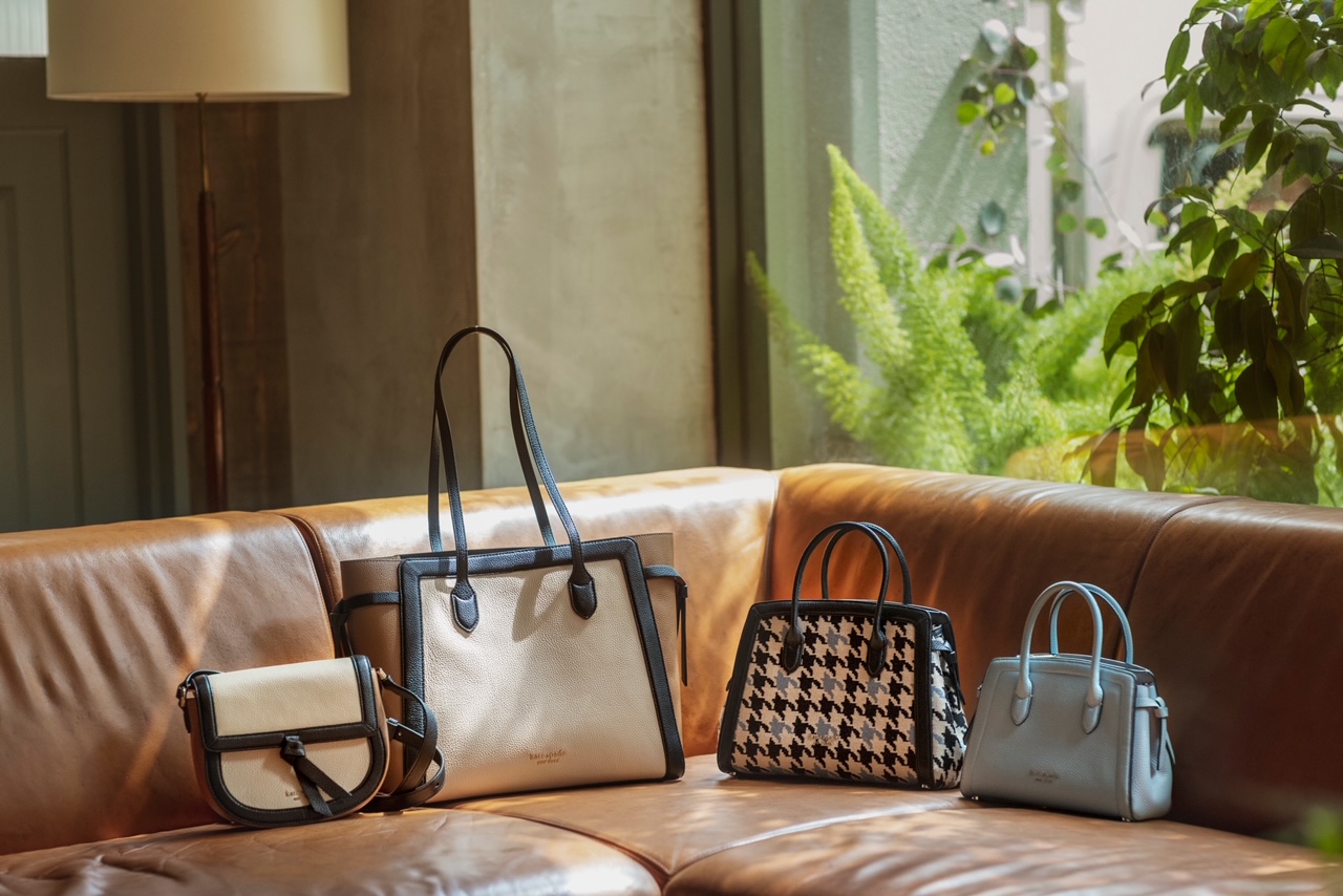 バイカラートートバッグ「knott large tote 」 〈 H29 × W37 × D14 ㎝〉 ¥49,500 千鳥柄バッグ「knott hound’s tooth medium satchel 」 〈 H20.5 × W28 × D10.5 ㎝〉 [ショルダーストラップ付き] ¥52,800 ブルーミニバッグ「knott mini satchel 」 〈 H16 × W21.5 × D9 ㎝〉 [ショルダーストラップ付き] ¥46,200(すべてケイト・スペード ニューヨーク/ケイト・スペード カスタマーサービス)