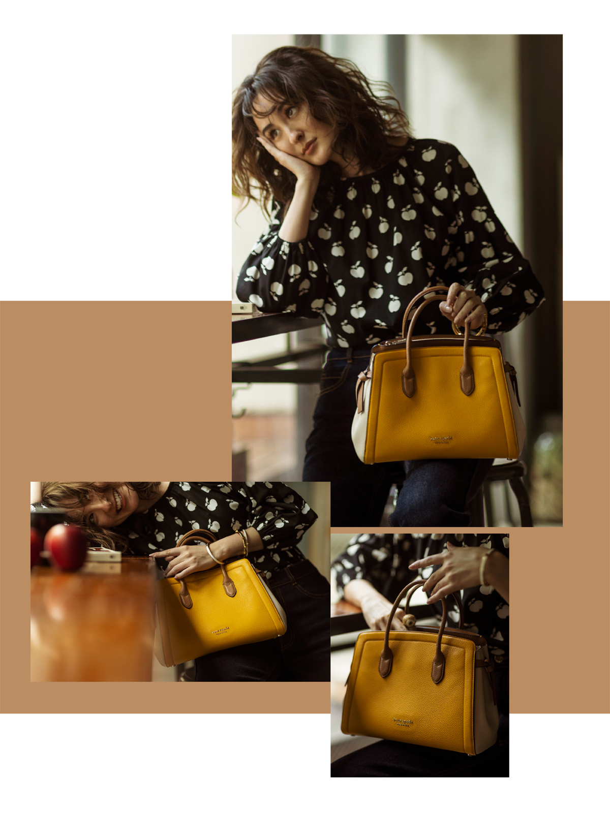 こんなブラウス(実はアップル柄!)×デニムに合わせたい。手に柔らかに馴染むレザーの風合いと秋気分を先取りするこっくり色を楽しんで。