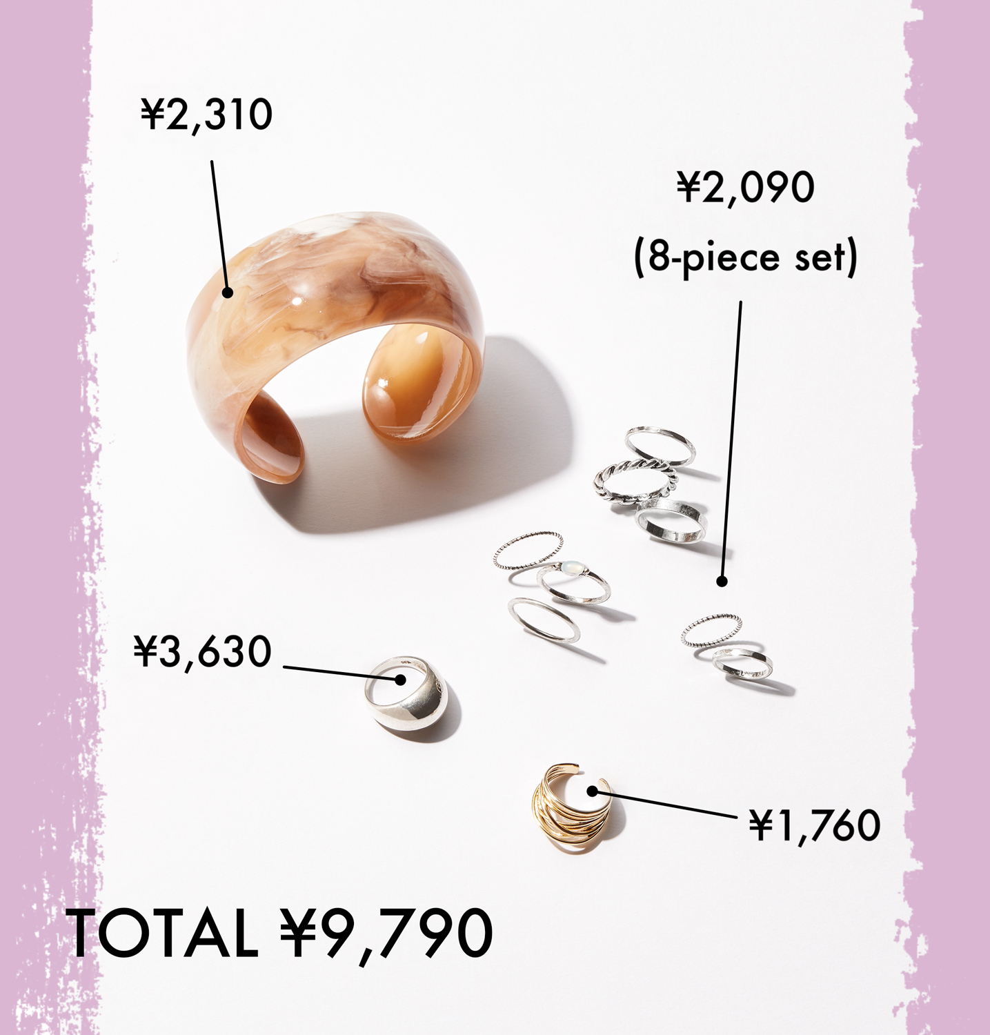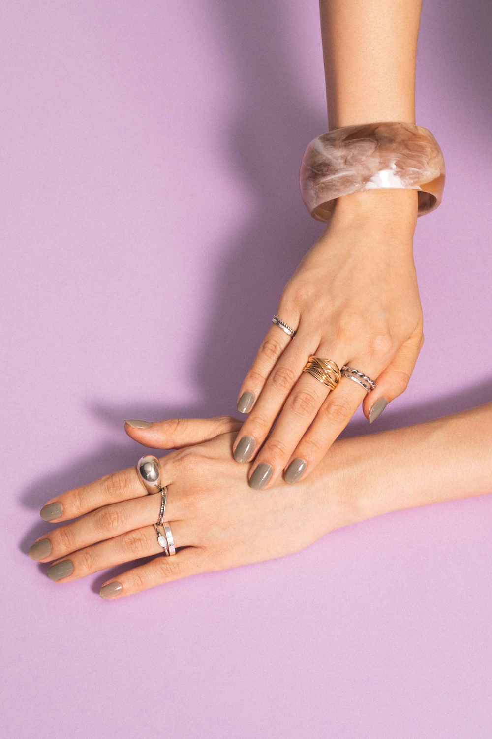 腕を華奢見せしてくれる大ぶりバングルはひとつで十分な存在感。手首にポイントがあるから、リングもレイヤードに凝って華やかに。細めのリングを重ねたり、ぷっくり太めリングをアクセントにしたり。シルバーの中にゴールドリングを1点投入して、ひと目立ちさせても可愛い♡ 思い切ったレイヤードこそ、コスパブランドで賢く叶えて。