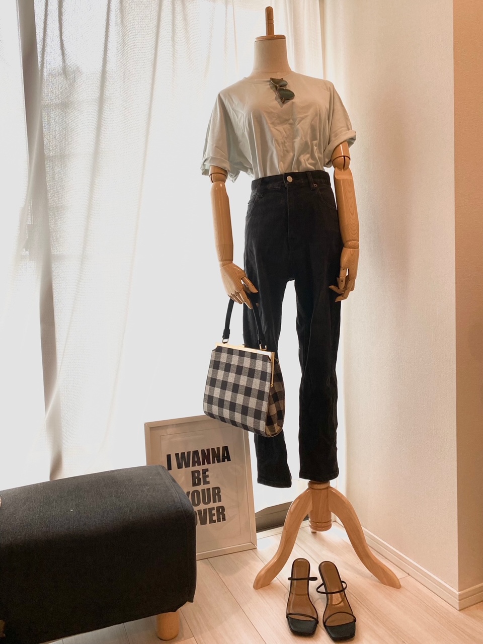 T-Shirts→ebure、Denim→THE NEWHOHUSE、Bag→MANSUR GAVRIEL、Sunglasses→GARRETT LEIGHT CALIFORNIA OPTICAL、Sandals→AKTE