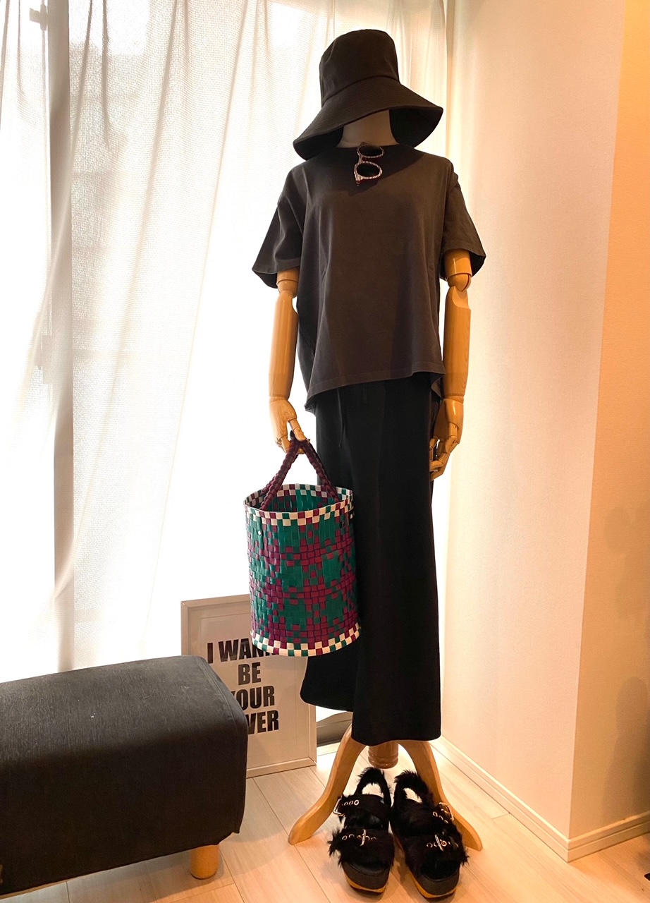 T-Shirts→THE NEWHOUSE、Skirt→Shinzone、Hat→11AM、Sunglasses→illesteva、Bag→Marni、Sandals→Marni