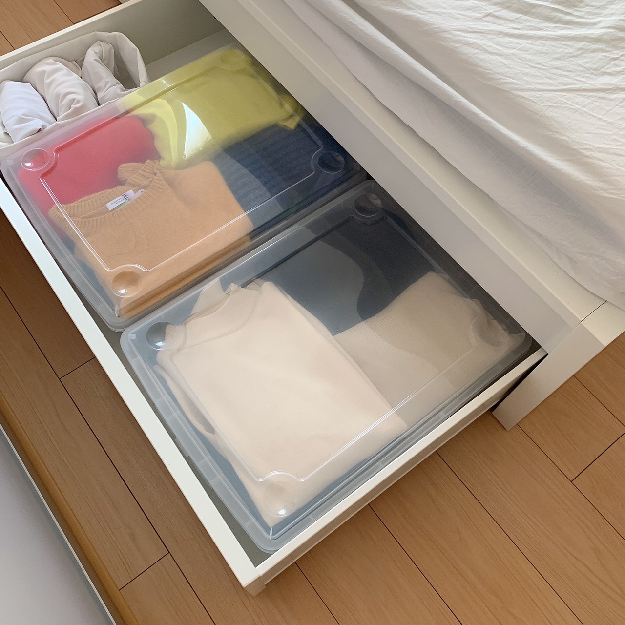 「ベッド下に収納ボックスを取り付けられる、ベッドフレームを愛用中! 我が家はウォークインクローゼットしか洋服を収納できるスペースがないので、ベッド下をフル活用したくて、このベッドフレームにしました。主にここに収納しているのは、季節外の洋服。ただ畳んで入れるだけではどこに何があるか分からないので、透明の収納ケース(DAISOで一つ500円)に防虫剤を入れてから、そこに収納しています。衣替えの時はケースごと引き出して中身を変えるだけなので、要領よく衣替えができるようになりました!」(角田さん)