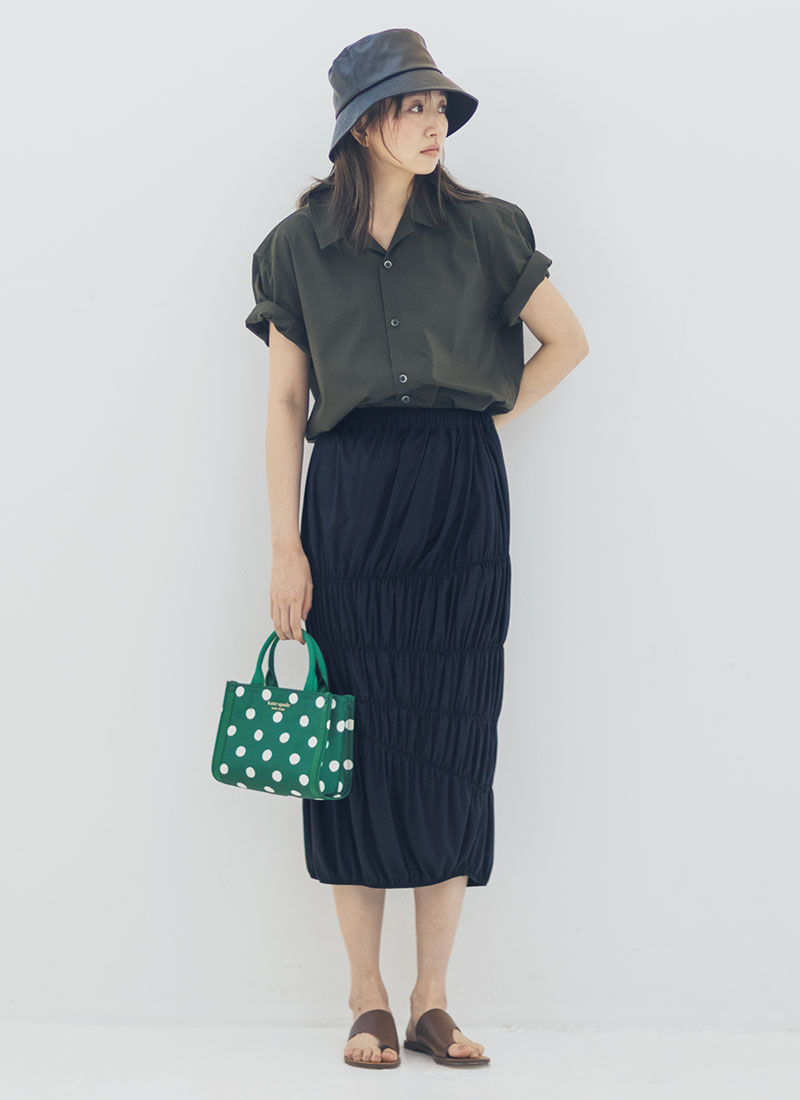 オリーブ×黒の辛口配色も気分。メンズのシャツ¥1,990(ユニクロ)スカート¥53,900(COATE FUKUYA CHIHARU DESIGN)バッグ¥29,700(ケイト・スペード ニューヨーク/ケイト・スペード カスタマ ーサービス)ハット¥3,190(アズ ノウ アズ ピンキー/AS KNOW AS)サンダル¥5,390(チャールズ&キース/チャールズ&キース ジャパン)