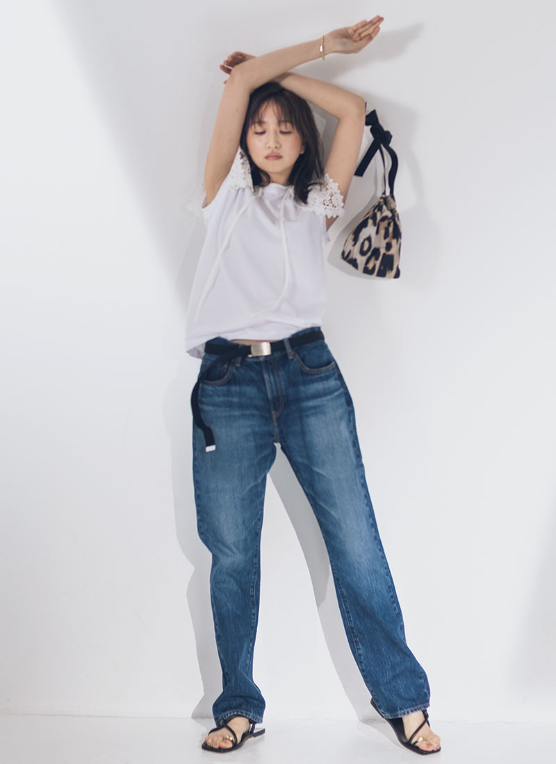 メンズのデニムパンツ¥3,990(ユニクロ)2枚組のカットソー¥3,080(ヘインズ/ヘインズブランズ ジャパン カスタマーセンター)付け衿¥3,190(アズ ノウ アズ ピンキー/AS KNOW AS)ベルト¥2,090(サンタモニカ 表参道店)バッグ¥6,050(ダブルスタンダードクロージング/フィルム)サンダル¥46,200(サクラ/インターリブ)