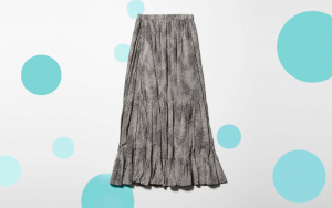 お天気が不安定なときは、水跳ねが目立たない柄スカートが◎。乾きやすい素材だと、なお助かります。ウエストがゴムで動きやすく、裾がフリルでフェミニンなシルエットも楽しめるなど、大充実の一着。