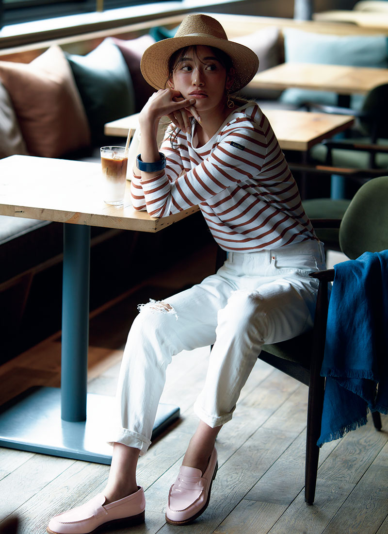 清潔感とこなれをさらっと両立した夏カジュアルは好感度間違いなし。ボーダーカットソー¥12,100(ルミノア/ゲストリスト)デニムパンツ¥25,300(ポロ ラルフ ローレン/ラルフ ローレン)バッグ¥40,700(ヴァジック/ヴァジックジャパン)帽子¥6,490(バナナ・リパブリック)ストール¥52,800(スロー)ローファー¥121,000(ジェイエムウエストン/ジェイエムウエストン 青山店)ピアス¥9,900(ワンエーアールバイウノアエレ/ウノアエレ ジャパン)バングル¥8,640(アビステ)