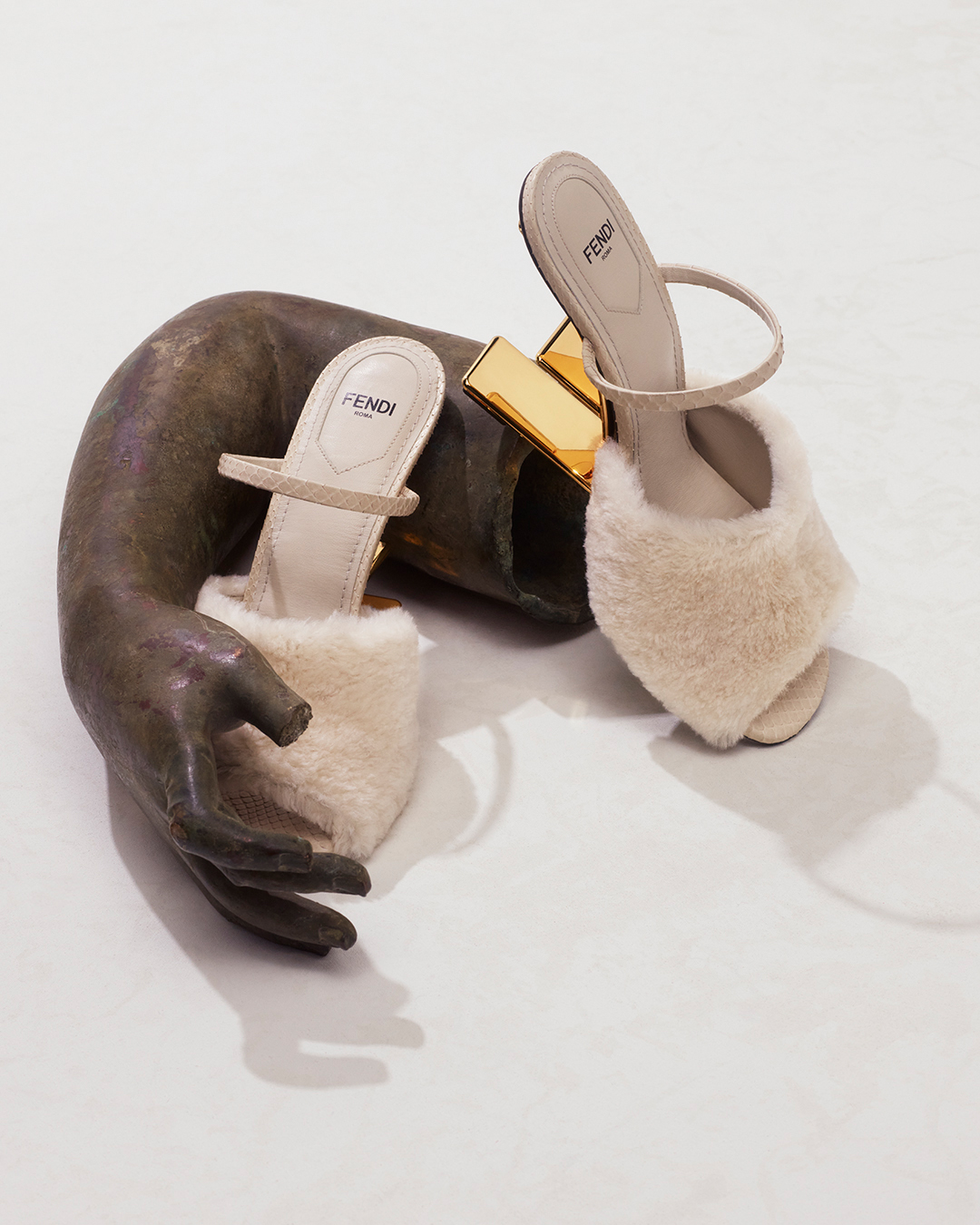 「フェンディ ファースト」シリーズから登場するシューズは、2000年に発表されたカンチレバーヒールのフォルムを再構築した新デザイン。ミュールのヒール部分に逆さにしたフェンディの頭文字“F”をあしらい、美しいフォルムと機能を両立。柔らかなシアリング素材と光沢のあるレザー、印象の違う2パターンの素材でお目見えします。