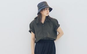 7月22日(木)、オリーブの絶妙な色合いが上級者っぽいユニクロの「メンズシャツ」は、袖をロールアップしてゆるっと着こなすのがコツ。ギャザーが女性らしいタイトスカートを合わせてバランスを取って。緩急ある着こなしが、こなれ感を演出します。レザーのバケットハットやトングサンダルでモードにまとめつつ、グリーンのドット柄バッグで遊びを効かせると◎。