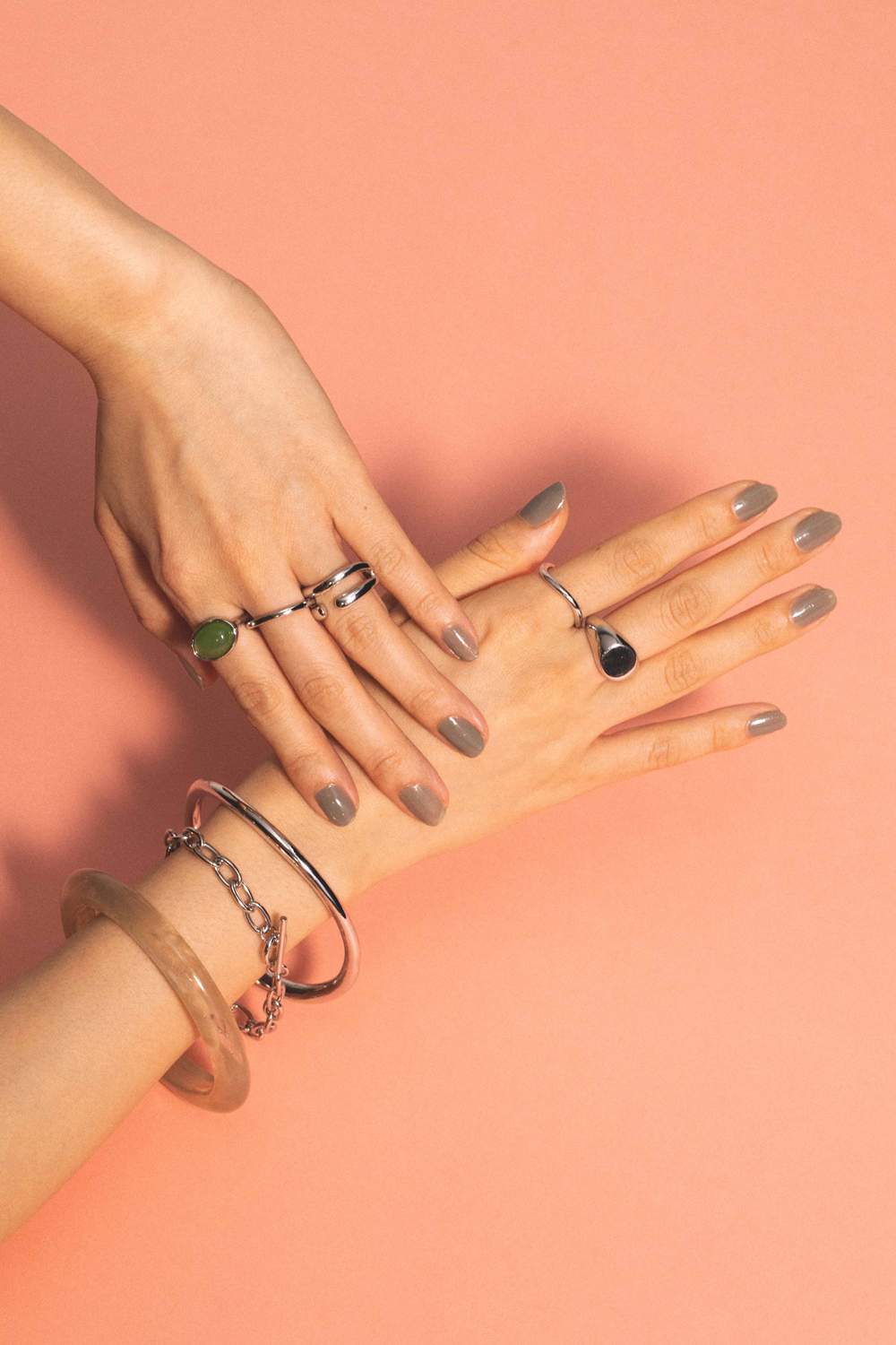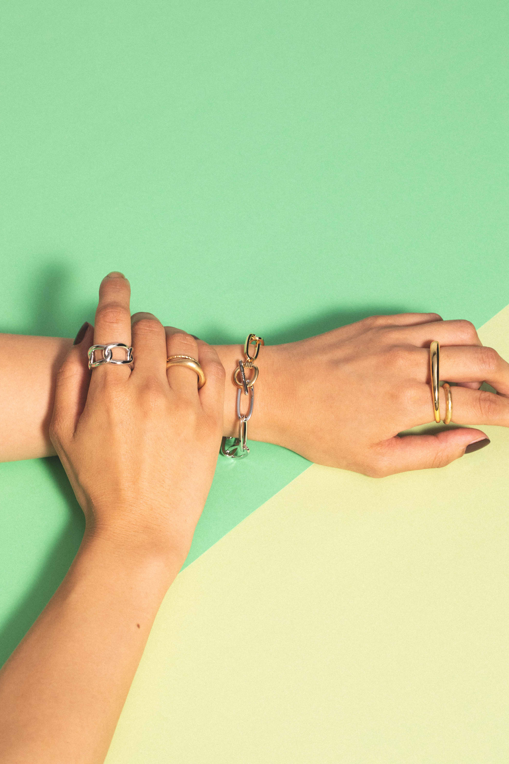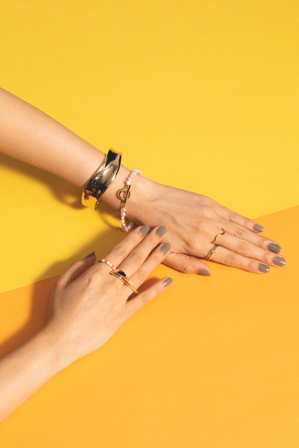 腕を華奢見せしてくれる大ぶりバングルはひとつで十分な存在感。手首にポイントがあるから、リングもレイヤードに凝って華やかに。細めのリングを重ねたり、ぷっくり太めリングをアクセントにしたり。シルバーの中にゴールドリングを1点投入して、ひと目立ちさせても可愛い♡ 思い切ったレイヤードこそ、コスパブランドで賢く叶えて。