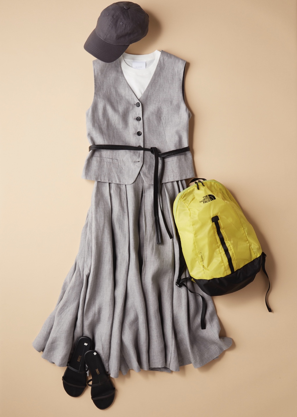 サンダル¥8,800(ティキーズ/エスケーパーズオンライン)リネンベスト¥47,300スカート¥64,900(ともにebure GINZA SIX店)ノースリーブカットソー¥8,580(スローン)キャップ¥5,500(アッパーハイツ/ゲストリスト)デイパック¥7,150(ザ・ノース・フェイス/ゴールドウイン カスタマーサービスセンター)