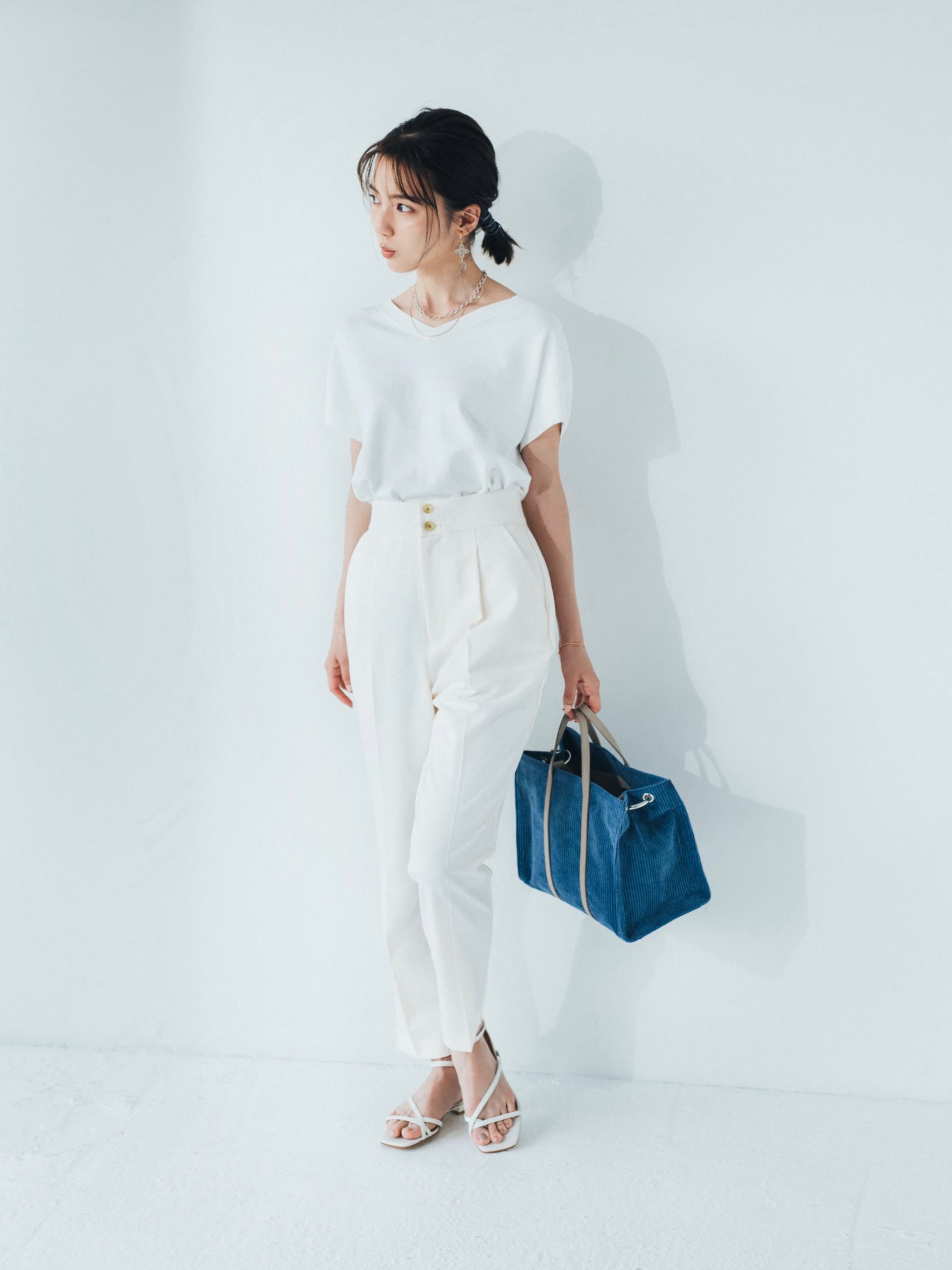 今回着用したテーパードパンツはヒールを履かなくてもぴったりの丈感。股上の深さや膝位置の高さなどミリ単位で計算され、美脚が追求されています。