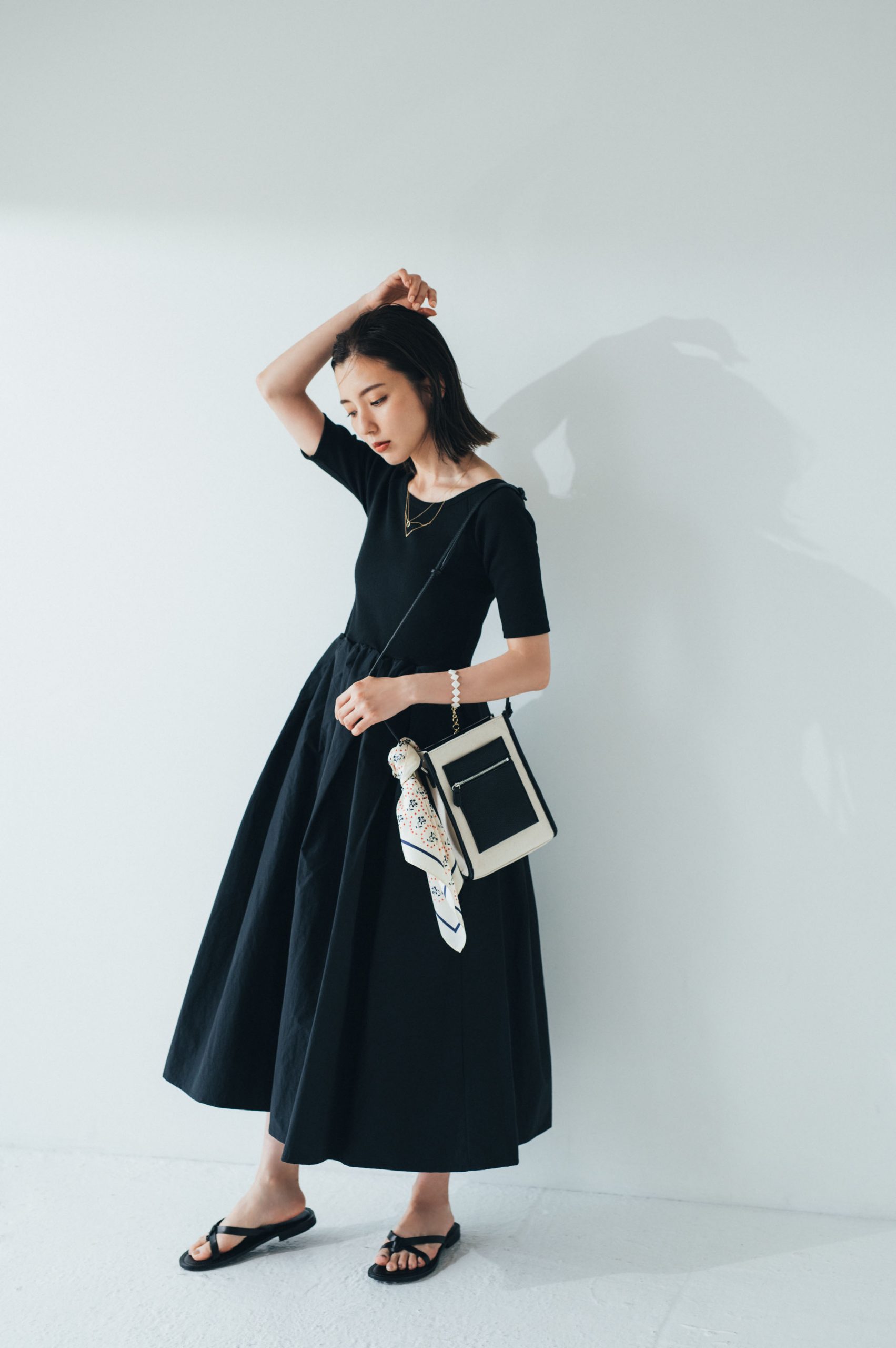 今回着用したワンピースは上半身がフィット感の高いリブニットに、体型カバーに一役買うフレアスカートの切り替えが上品。Sサイズさん特有の、上半身がゆるい問題もおしゃれに解決できる、理想のシルエットが叶うワンピースです。