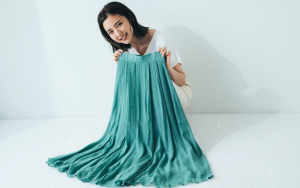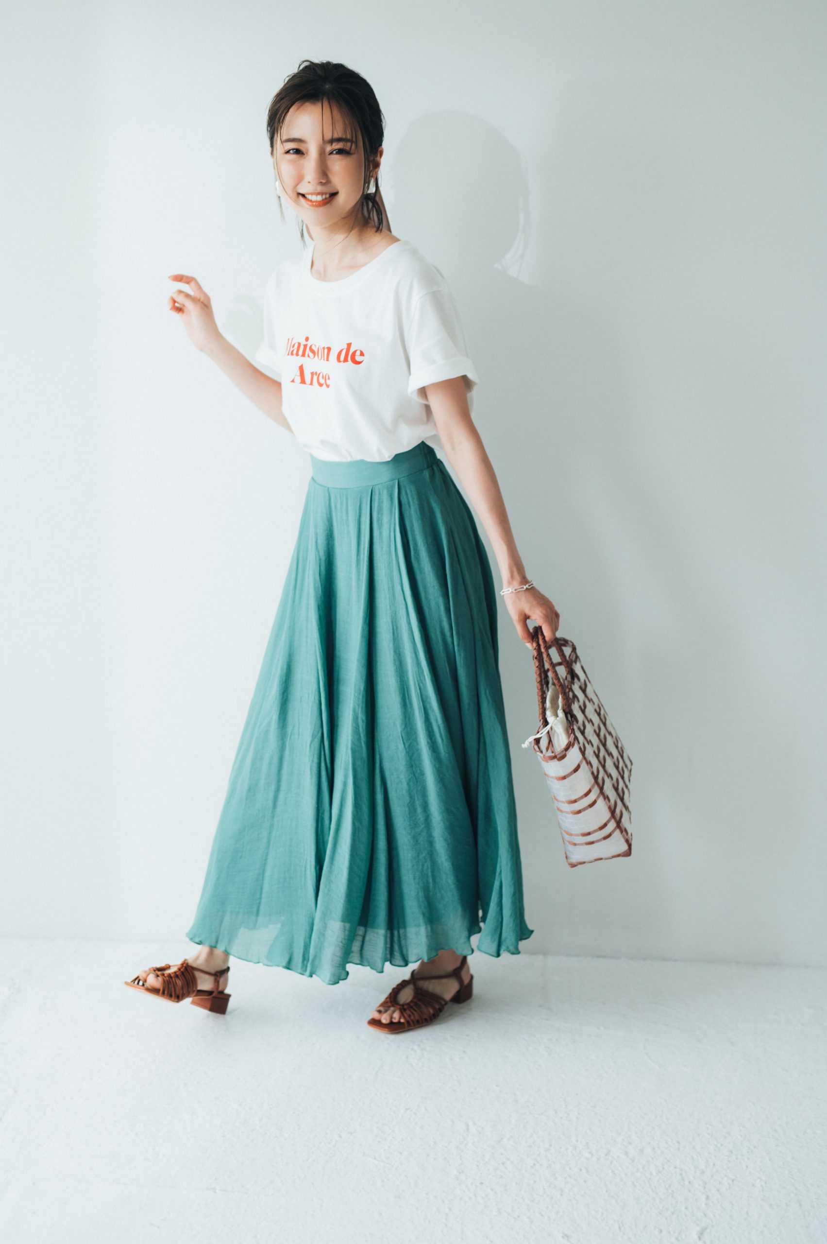今回着用したマキシ丈スカートはウエスト下が広がりすぎないので、気になるお腹下のぽっこり問題も解決してくれます。生地はさらっとしていて、今の季節も涼しく過ごせそう。