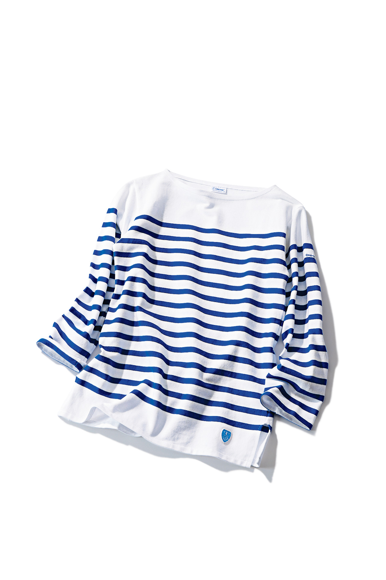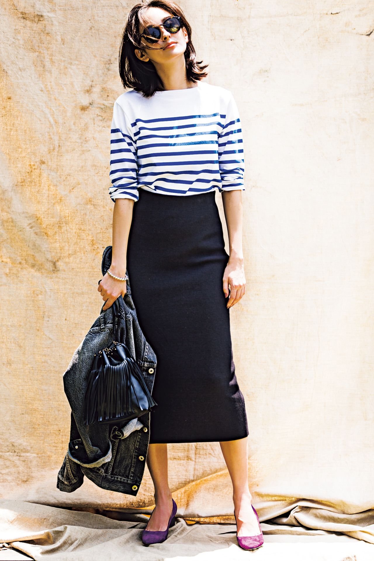 マリンTシャツの原形といわれる、白地にロイヤルブルーのボーダー。黒のロングタイトスカートでキュッと引き締めて、ハンサムに。