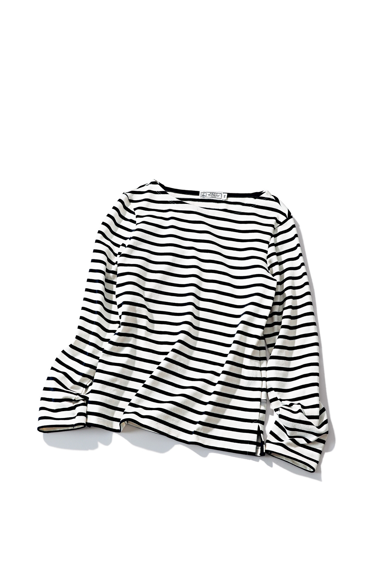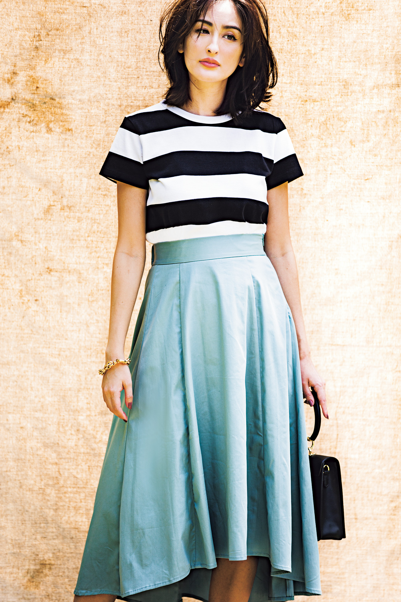 太ボーダーTは、少し短めの袖と女性らしいジャストなサイズ感が ポイント。フェミニンなスカートともバランスよく合わせられます。