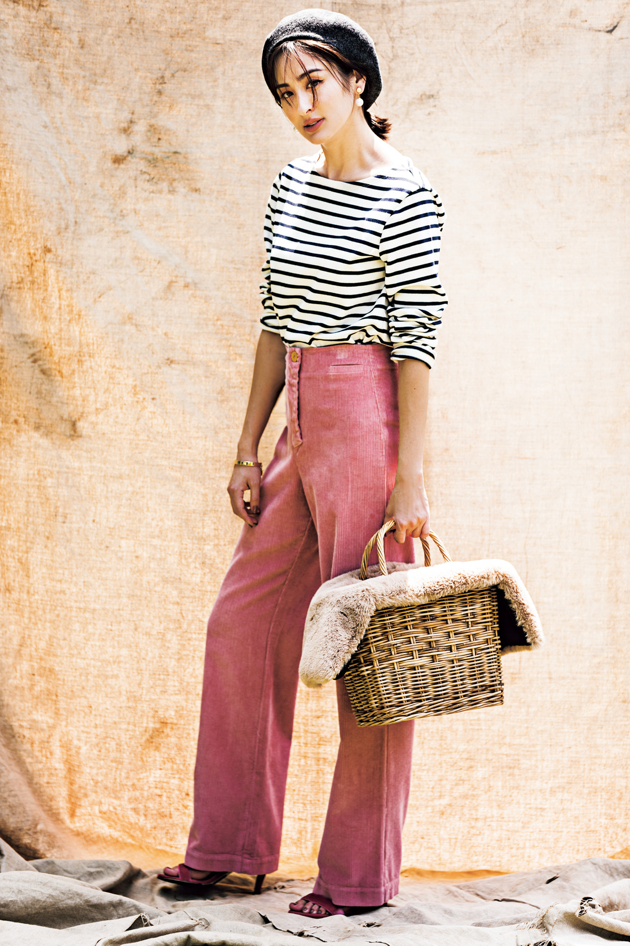 おしゃれしたい日に着る、存在感たっぷりのピンクコーデュロイの ワイドパンツ。安定感のある白×ネイビーのボーダーが頼りになる。