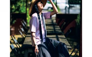 Tシャツ¥9,350(スローン)スカート¥38,500〈カレンソロジー〉帽子¥13,200〈フェルッチョ ヴェッキ〉(ともにカレンソロジー 新宿)バッグ¥83,600(ピエール アルディ/ピエール アルディ 東京)サンダル¥28,600(ファビオ ルスコーニ/ハイブリッジ インターナショナル)ネックレス¥23,870(パズ コレクティブ/ZUTTOHOLIC)バングル¥41,250(ノース ワークス/UTS PR)