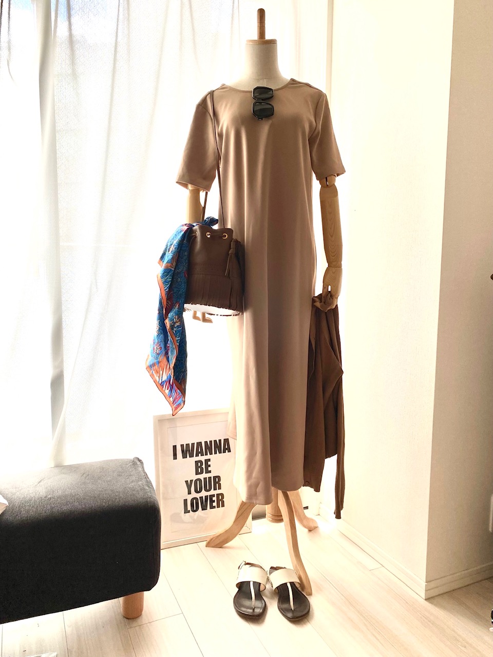 装飾のないシンプルなデザインで、ダボッとしたサイズ感のワンピは、ナチュラルタイプのしっかりとした肩幅があるからこそ、着こなせる一枚。肌に密着しないシルエットなので、風通しがよく、着心地がいいのが嬉しい。