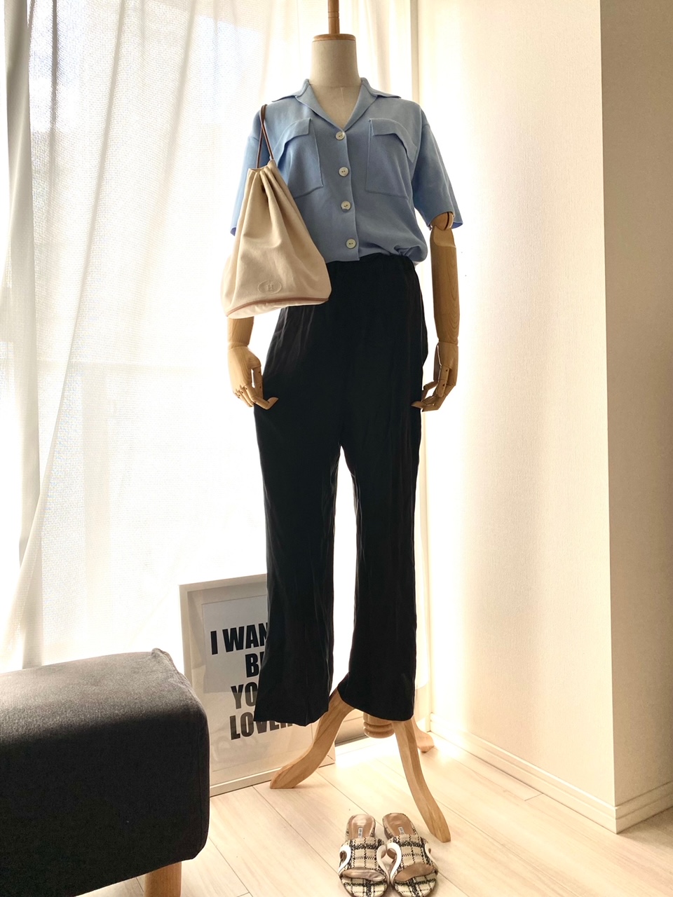 ネックラインがVにあいたシャツは、首が短めなストレート体型を細く長い印象に。淡いブルーをセレクトするだけで、見た目マイナス5℃の涼感コーディネートに仕上がります。シルクのネイビーパンツは通気性も◎。