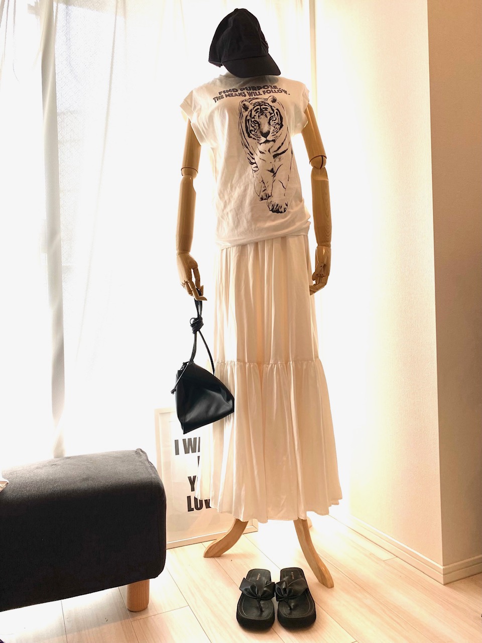 Beachsandals→RANDA、Tank top→Shinzone、Skirt→STUNNING LURE、Cap→NEW ERA、Bag→MARROW