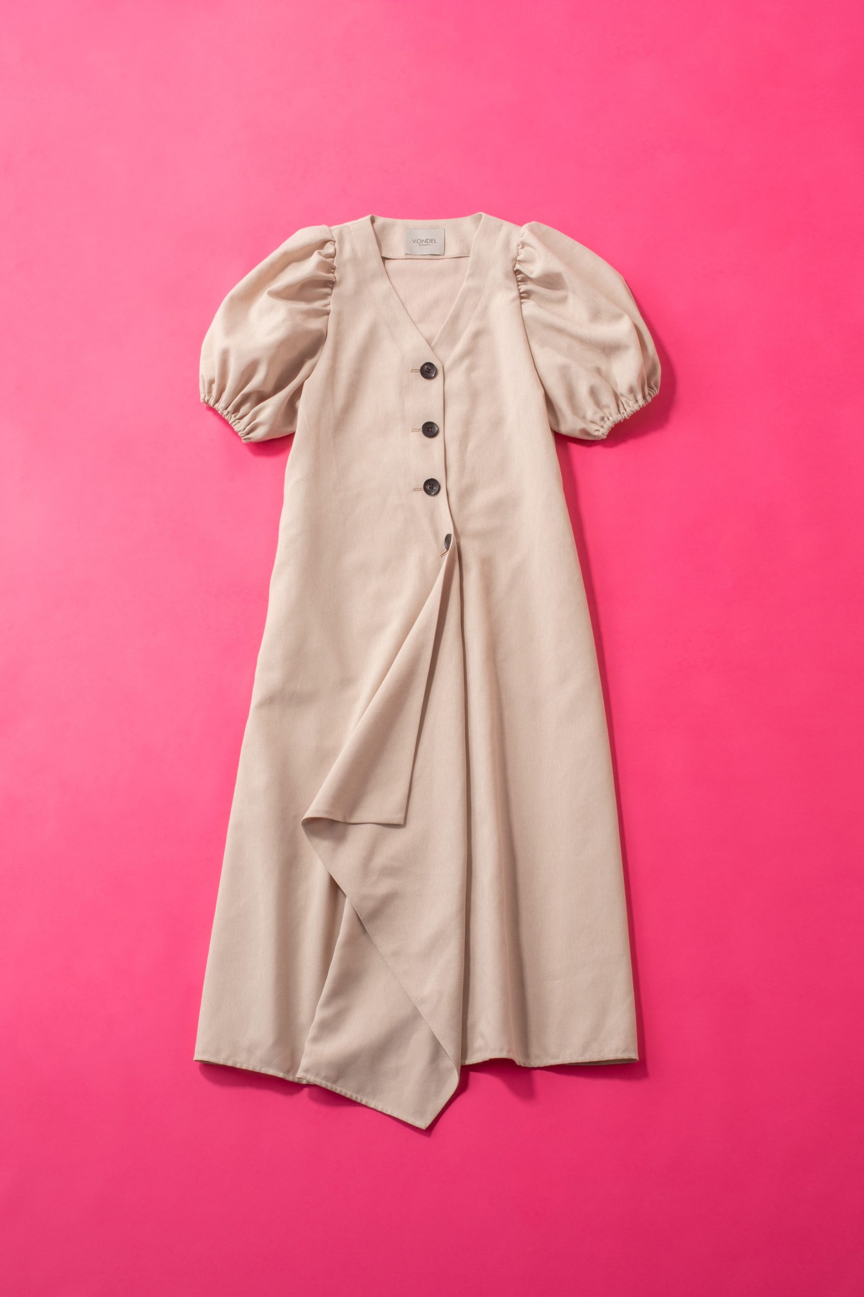 「袖のボリューム感が可愛いワンピースは、胸元がV開きでスッキリ! パンプスのようなかっちり系の小物を合わせるとコンサバな雰囲気になるので、私は基本的にバッグも靴もカジュアルなものを合わせています。その方が今っぽい雰囲気になる気がして。この前はかごバッグを合わせました!」
