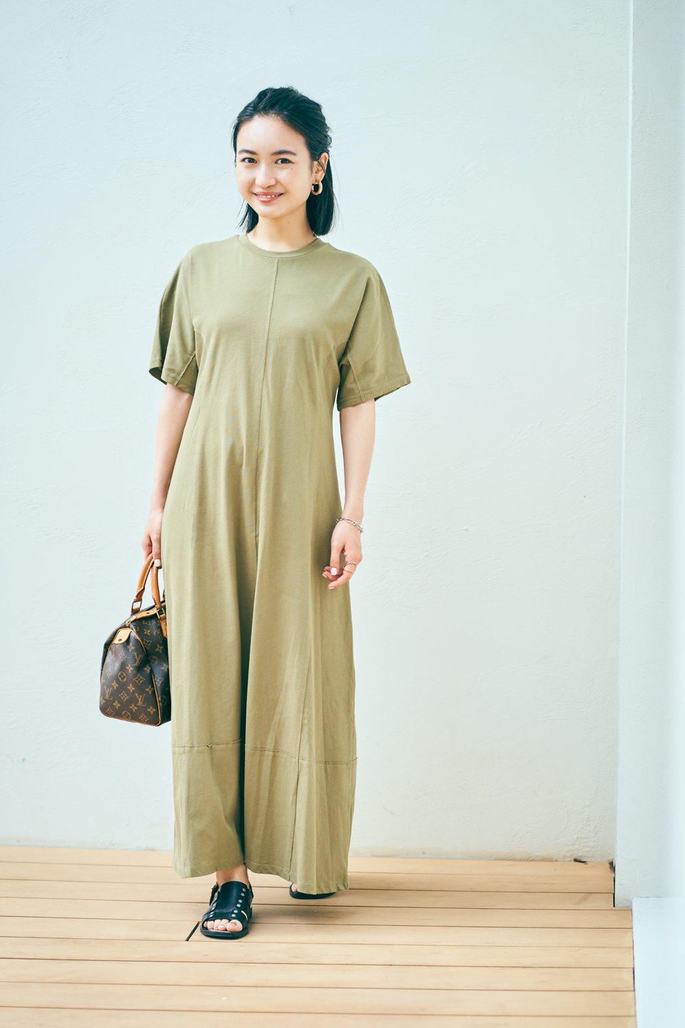 「モノグラムのブラウンと、トーンが似ているカーキのワンピで夏のアースカラーコーデに。色数を抑えたシックなコーディネートがしっくりきます」