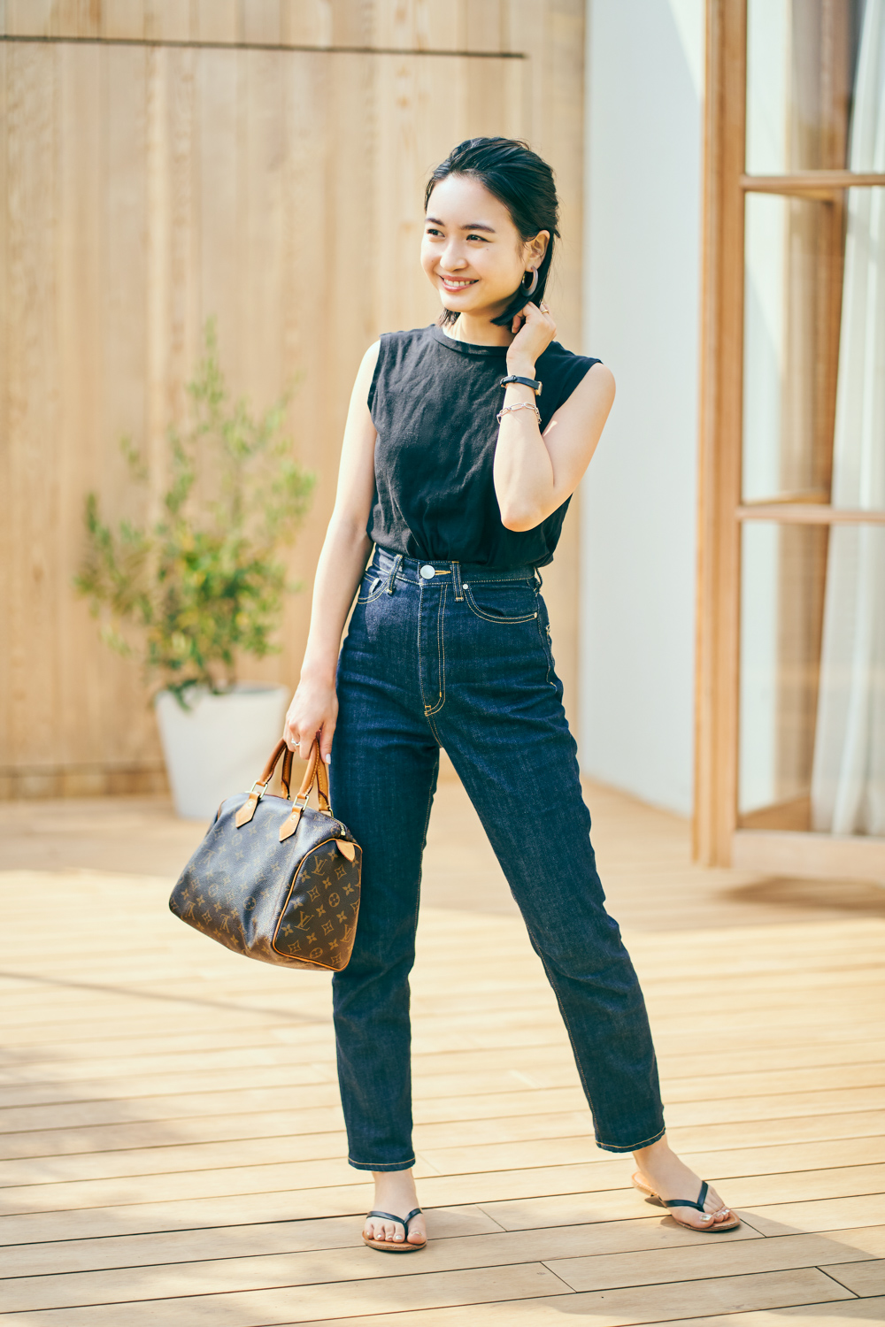 「デニムにカットソーにビーサンと、シンプルな着こなしにスピーディを合わせるスタイルが大好きです。スピーディの存在感のおかげで、夏のワンツーコーデが上品に仕上がります」