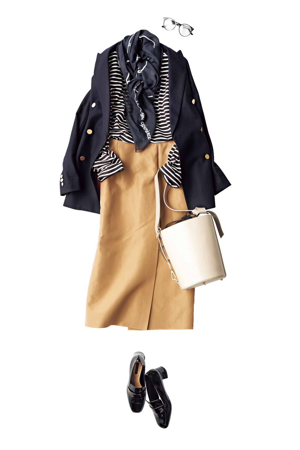 テーラードジャケットでスマートさを、タイトスカートでスッキリしたIラインをつくってオフィスらしいスマートさを。白×黒ボーダーカットソー¥13,000(ミミ&ロジャー)ジャケット¥29,000〈スピック&スパン〉バッグ¥22,000〈メゾン ヴァンサン〉(ともにスピック&スパン ルミネ有楽町店)スカート¥45,000(エッフェ ビームス/ビームス ハウス 丸の内)メガネ¥19,000(レイバン/ミラリ ジャパン)ストール¥8,900(アルテア/アマン)ローファー¥28,000(ファビオ ルスコーニ/ドゥエ パッシ ペル ウォッシュ ルミネ横浜店)
