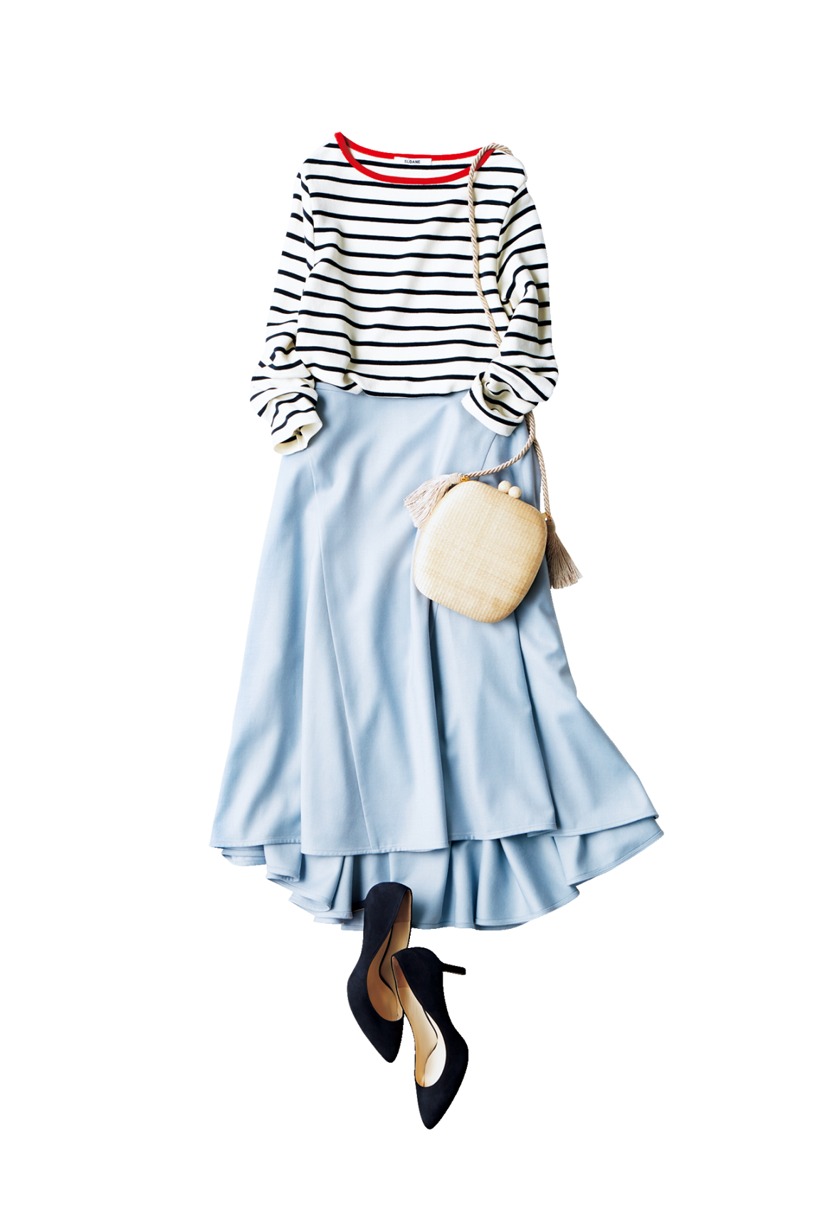 キレイな動きの出るフレアスカートと、女性らしさのある小物選びで“男子ウケも狙えるボーダーデートコーデが完成します。白×黒ボーダーカットソー¥23,000(スローン)スカート¥23,000(エストネーション/エストネーション)バッグ¥27,000(SERPUI/ティースクエア プレスルーム)パンプス¥18,000(オデット エ オディール/オデット エ オディール 新宿店)