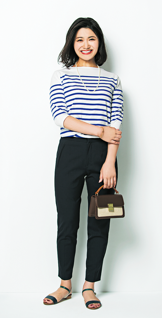 間延びした印象を解消するために、ボトムスは引き締め効果のあるものを。キレイめテイストの小物もスマートさを強調してくれます。パネルボーダーカットソー¥12,800(セントジェームス/セント ジェームス代官山店パンツ¥12,000(バンヤードストーム/エレメントルールカスタマーサービス)バッグ〈ショルダーストラップ付き〉¥11,800(ル・ベルニ/キャセリーニ)サンダル¥9,250(ステュディオス/ステュディオス ウィメンズ 新宿店)ネックレス¥4,440ブレスレット¥2,100(ともにJUICY ROCK)