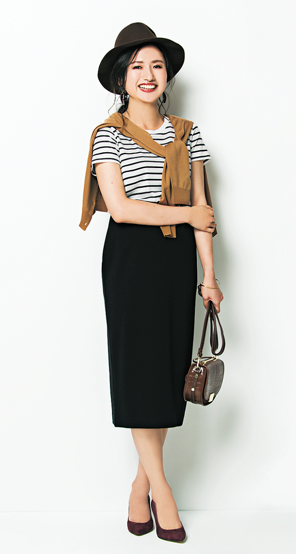 白×黒半袖ボーダーカットソー¥9,000(ダブルスタンダードクロージング/フィルム)カーディガン¥33,000(ジョン スメドレー/リーミルズ エージェンシー)帽子¥48,000〈ムールバウアー〉イヤリング¥7,000〈アレクサンドリン〉(ともにスピック&スパン ルミネ有楽町店)スカート¥1,990(UNIQLO)バッグ¥16,000(グーコミューン/グランカスケードインク)パンプス¥17,000(カリーノ/モード・エ・ジャコモ)ブレスレット¥3,900 (JUICY ROCK)