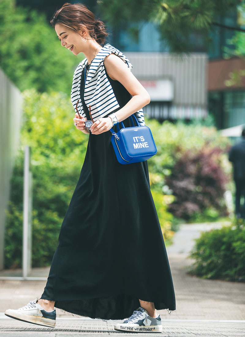 丈感が今っぽい黒ワンピはボーダートップスを肩掛けしたり、ポイントになるロゴバッグで差し色を加えました。